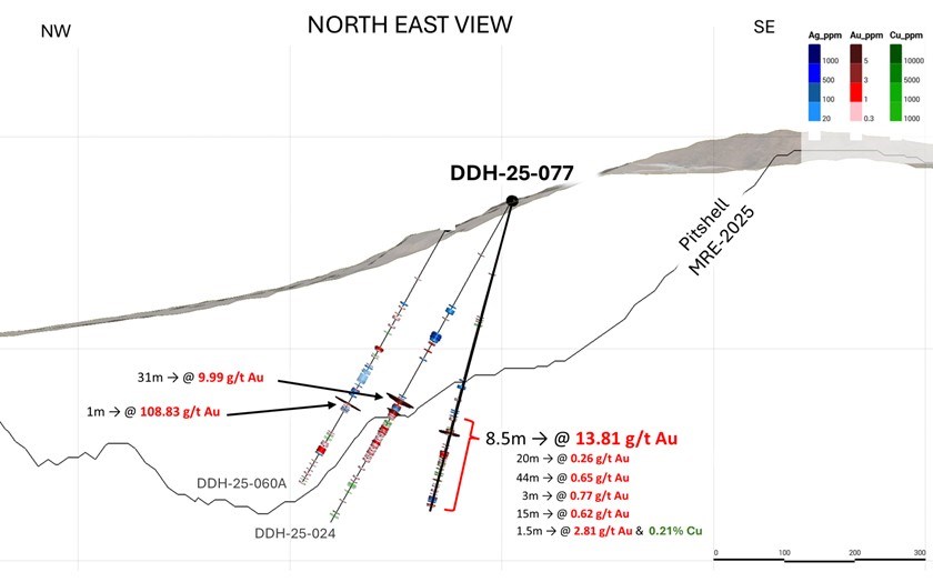 - DDH 25-077: A high-grade interval of 13.81 g/t gold over 8.5 m from 317 m, and a separate interval of 44.0 m at 0.65 g/t gold from 368 m