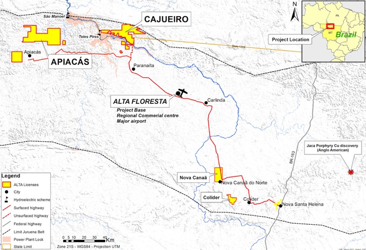 The Cajueiro district is located approximately 75km NW of the town of Alta Floresta in the state of Mato Grosso (Figure 1) in central western Brazil. The project is easily accessible by road, lies on open farmland and has grid power and a local water supply. Cajueiro is the most advanced of the key projects that Altamira controls in the region (Figure1).