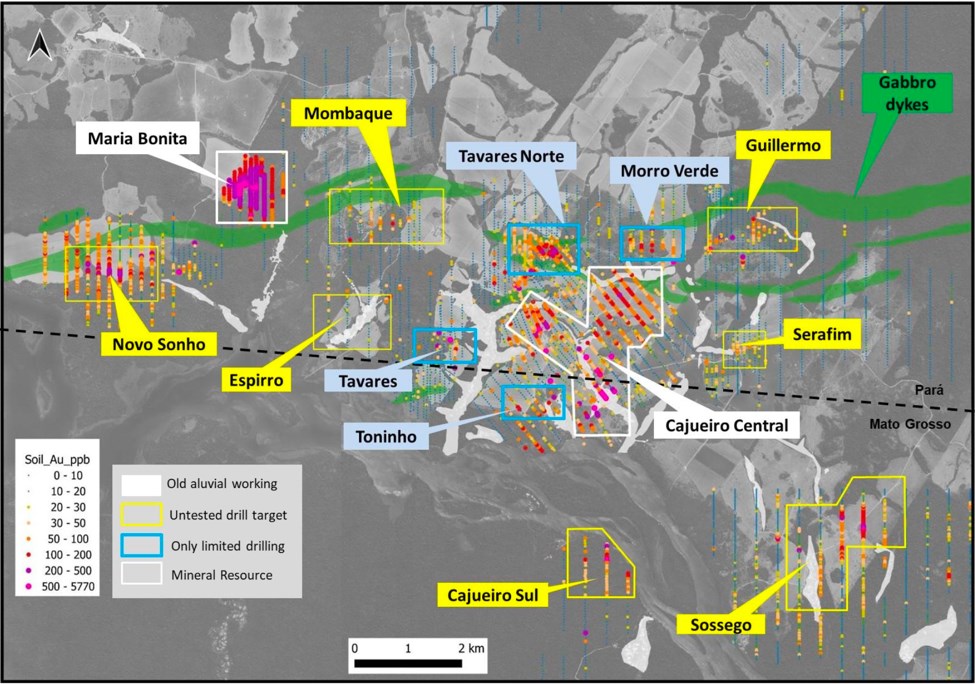 The Maria Bonita porphyry gold deposit forms part of a district-scale portfolio of prospects that are interpreted as having a similar geological origin (Figure 2). The Cajueiro area is characterized by a 15km stretch of former alluvial gold workings along the Teles Pires river. The source of some of this alluvial gold is related to a pronounced east-west corridor of gold anomalies in soils and rock chips and a set of sub-cropping intrusions extending east-west over 8km, implying the presence of a long-standing and deep-seated crustal structure.