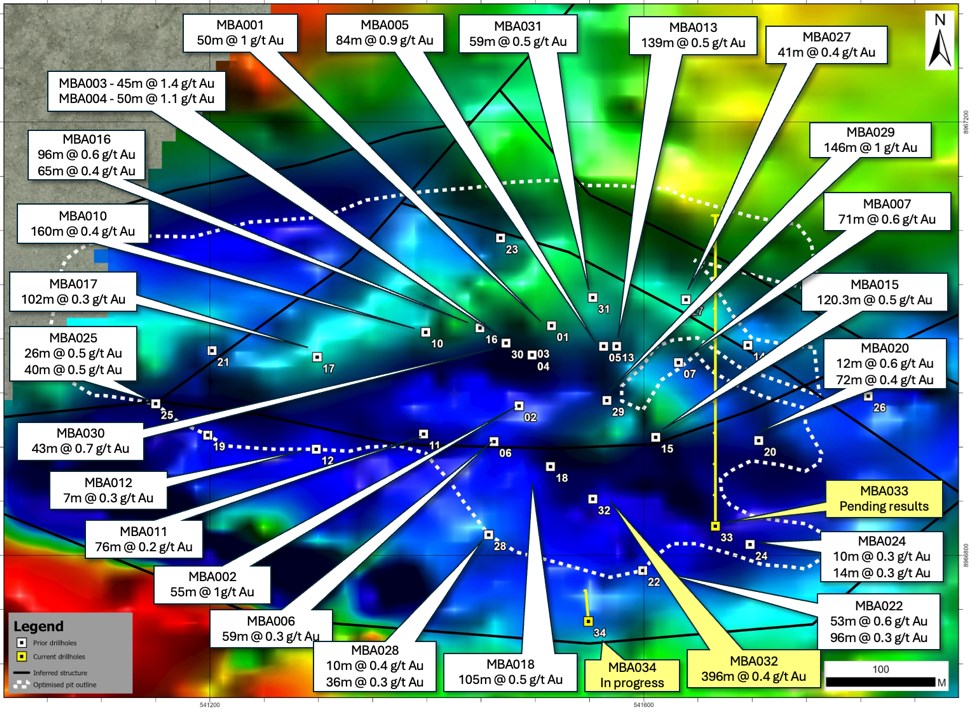 The first drill hole of the current program, MBA032, was completed to a depth of 546 metres and returned 395.5m @ 0.4 g/t gold from 44.5m depth in the same quartz porphyry intrusive that was intersected in previous drilling (see press release dated October 15, 2025).