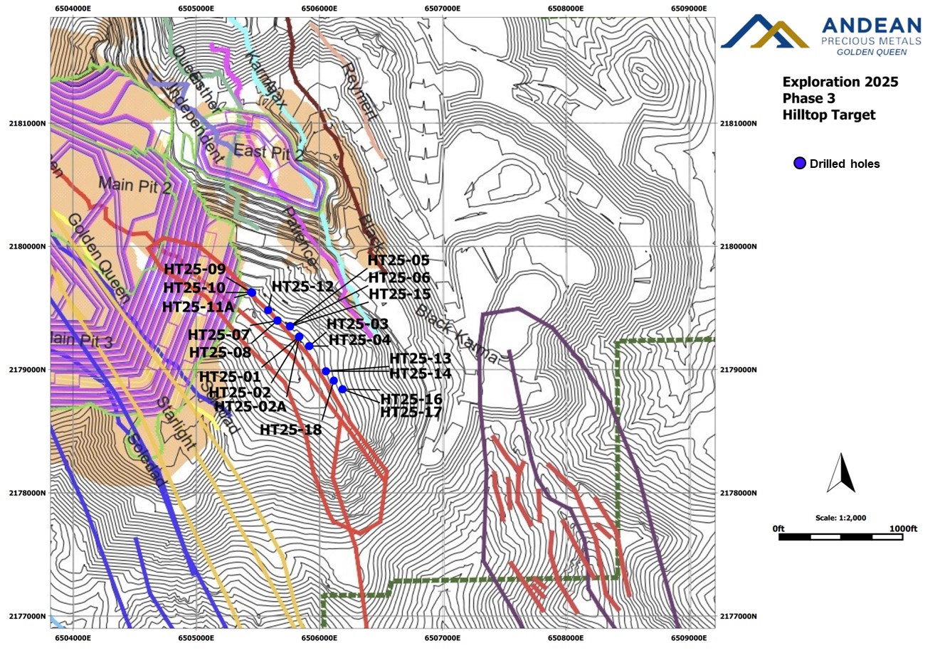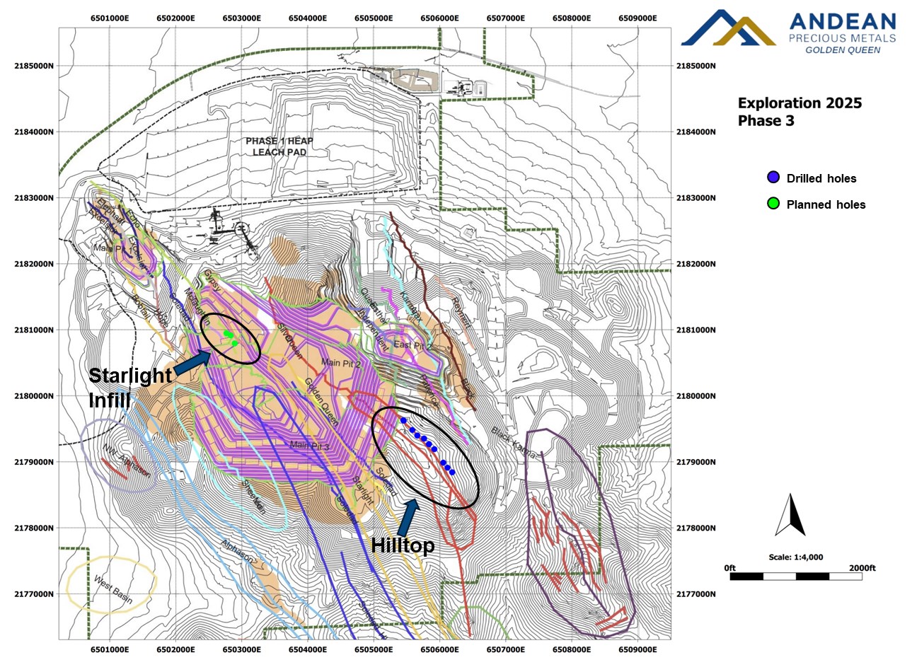 The 2025 Exploration Program at Golden Queen initiated Phase 3. This phase consists of 4,300 metres of core drilling and is focused on extending the mine life by exploring the Hilltop area, which represents the southeast extension of the Silver Queen vein, as well as expanding current mining zones into areas of limited exploration data, primarily the Starlight Vein in the southeast trend of Main Pit 2.
