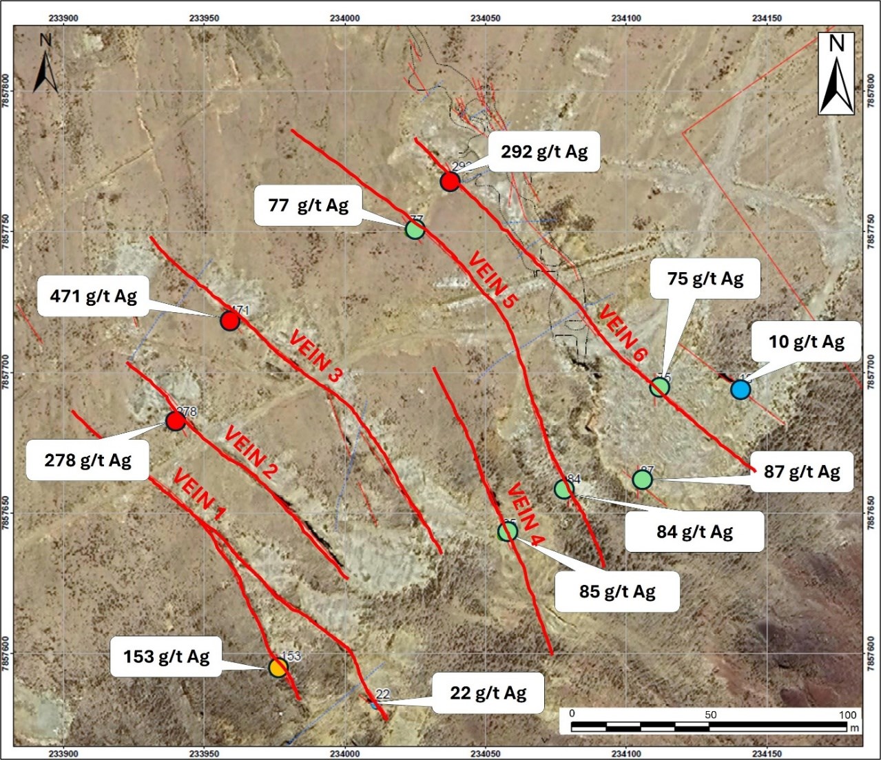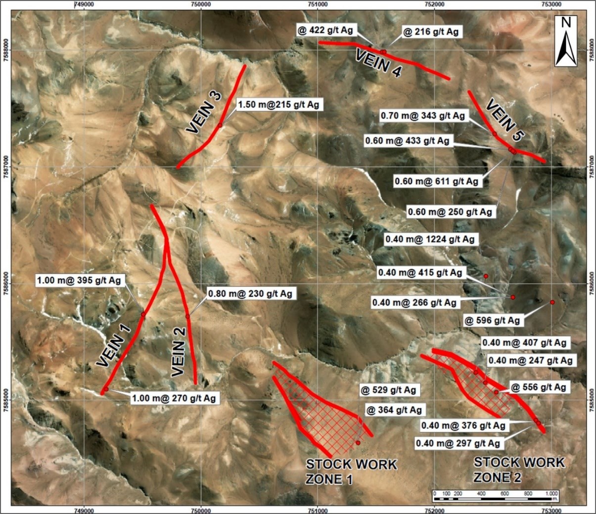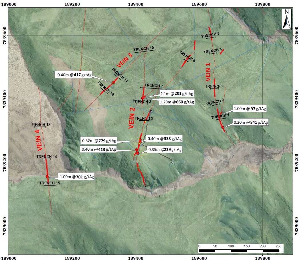 Our initial geochemical surface sampling reports the following results: Vein 1: 221 g/t Ag; Vein 2: 402 g/t Ag, Vein 3: 244 g/t Ag; Vein 4: 358 g/t Ag. The mineralized structure has an average width of 1.0 metre grading 311 g/t Ag.