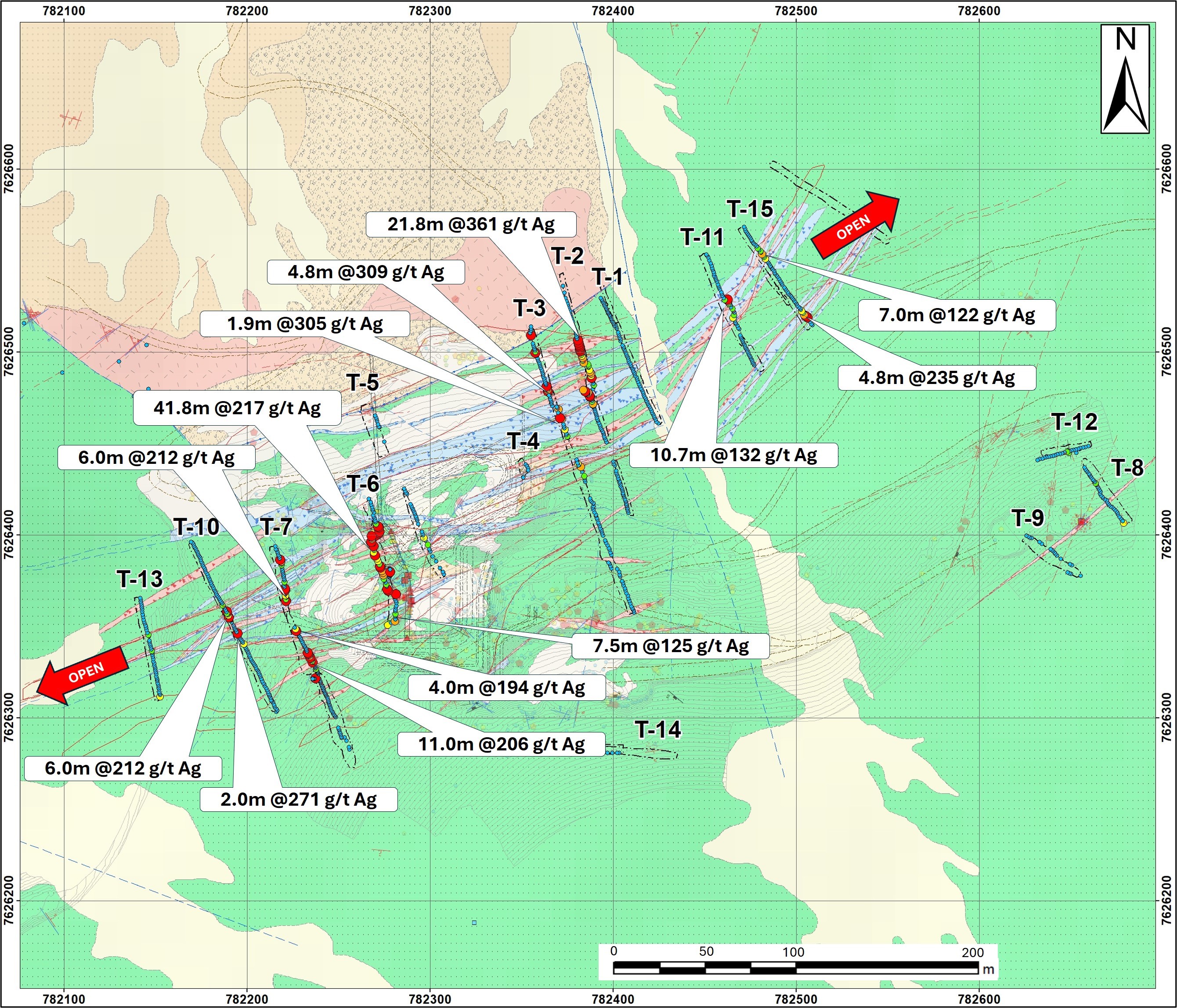 5,500 metres of shallow core drilling to begin in Q4 2025, targeting ~800,000 tonnes grading 150-250 g/t Ag.