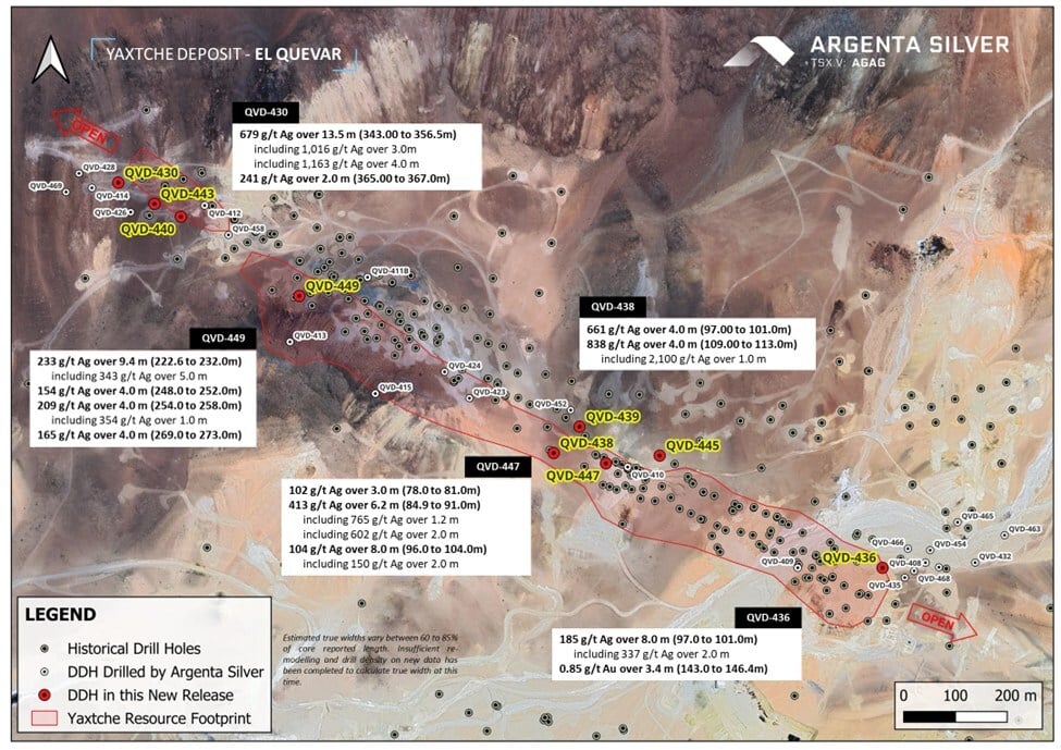 VANCOUVER, BC, April 16, 2026 /CNW/ – Argenta Silver Corp. (TSXV: AGAG) (OTCQX: AGAGF) (FSE: T1K) (“Argenta” or the “Company“) is pleased to report the third set of assay results from its ongoing 2025–2026 Summer Diamond Drilling Campaign at the El Quevar Project in Salta Province, Argentina. The latest multiple high-grade silver intervals intersected outside the Yaxtché Deposit (“Yaxtché”) resource limits, continue demonstrating mineralized continuity over the northwest extension (step-out holes QVD-430, QVD-440, and QVD-443) and in the southeast extension (including step-out hole QVD-436) (Figure 1, Figure 2, Table 1, and Table 2). Notably, other holes successfully intercepted high-grade silver within >100-meter spacing between existing drill holes within the Yaxtché Deposit; specifically, hole QVD-438 returned 2,100 g/t Ag over 1.0m. These results confirm the continuity of mineralization in areas previously devoid of drilling, effectively de-risking the central part of the deposit.