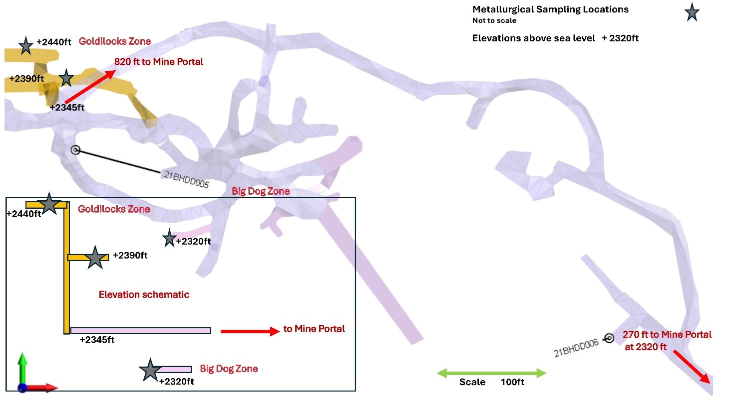 One sample will be taken from the newly established Big Dog Zone working face as reported in the Company’s news releases, BHS2022-05 and BHS2022-08 and two samples will be taken from the middle and top of a 30.5m (100 ft raise) up into the Goldilocks Zone where, at the top, Silver King Mines in 1984 mined high grade rounds grading up to 3110 g/t Ag (100oz/Ag) per ton, and in the middle where the Company drill intersected 3.65 meters (12 feet) of 844 g/t (24.67 oz/t) silver of which the highest grade interval was 0.6 m (2 feet) of 2,180 g/t (63.65 oz/t) silver, as reported in the Company’s news release, BHS2021-19.