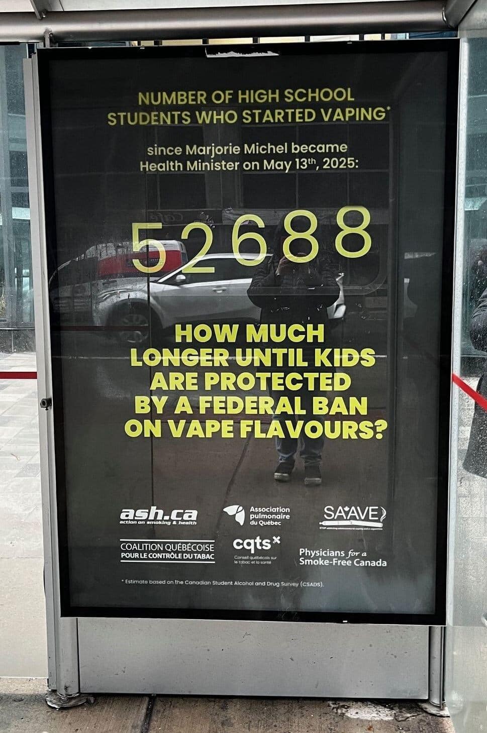 Bus shelter ad highlights 50,000 high school students who’ve started vaping since Federal Health Minister Marjorie Michel took office, demands national ban on flavoured e-cigarettes