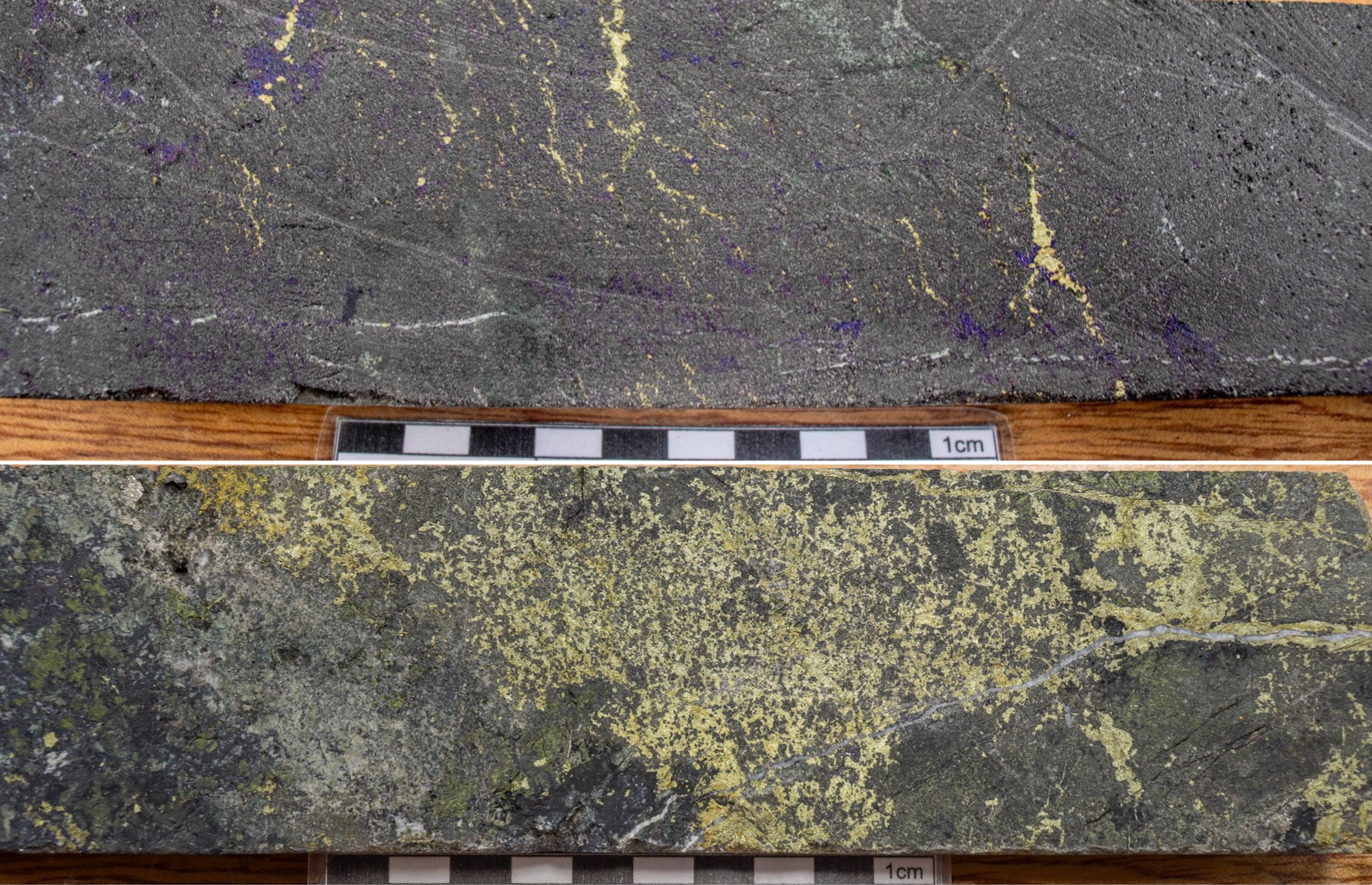 Figure 2. Slab photos of mineralized intervals. (Top) KHZ5825-003 at 362.7m downhole depth showing massive magnetite skarn with bornite and chalcopyrite. Assayed interval resulted in 1.05m at 2.03% Cu, 0.436 g/t Au, 8.89 g/t Ag and 27 ppm Mo. (Bottom) KHZ5790-001 at 77.5m downhole depth showing chalcopyrite and pyrite in magnetite-pyroxene-garnet skarn. Interval assayed 1.4m at 4.91% Cu, 0.419 g/t Au, 17.35 g/t Ag and 164 ppm Mo.