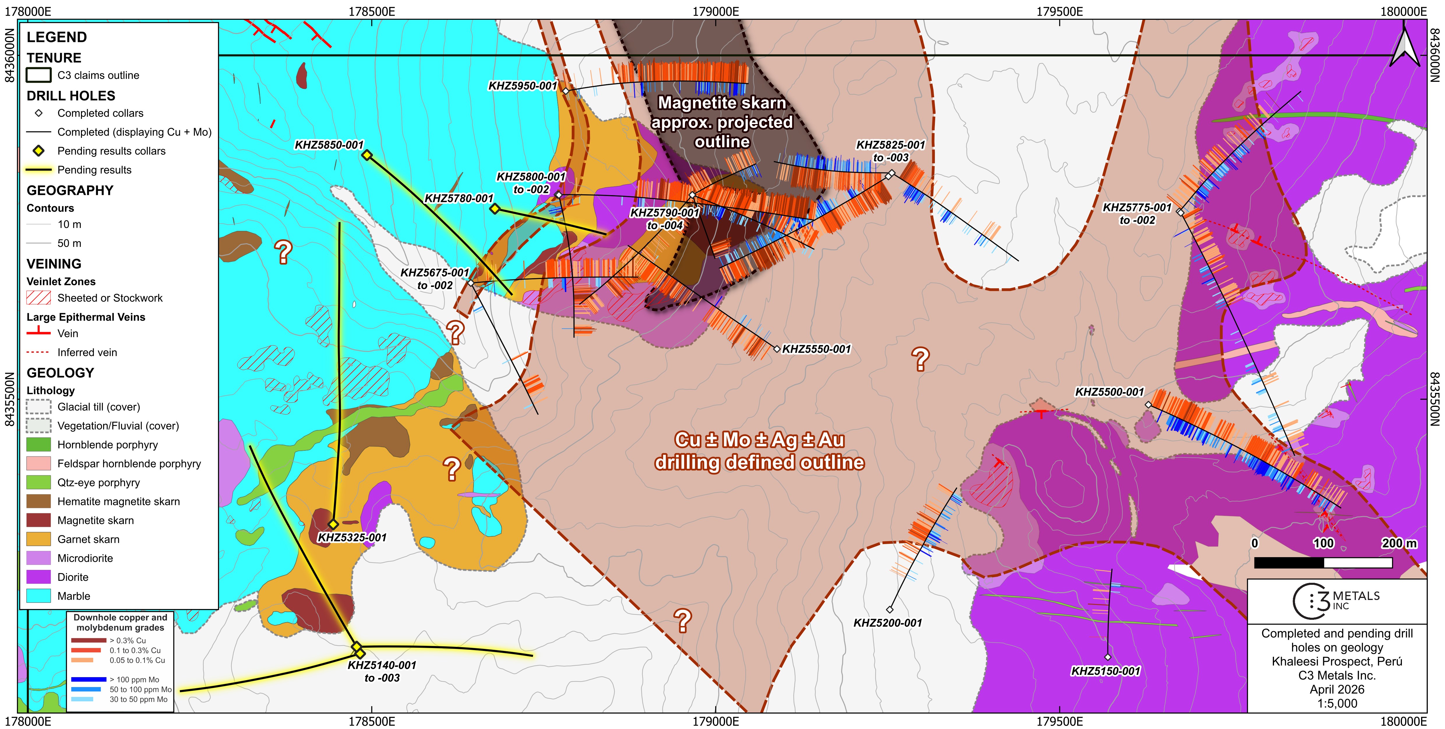Toronto, Ontario–(Newsfile Corp. – April 29, 2026) – C3 Metals Inc. (TSXV: CCCM) (OTCQB: CUAUF) (“C3 Metals” or the “Company”) is pleased to announce results from 11 additional holes drilled at its 100%-owned Khaleesi copper project (“Khaleesi” or “the Project”) in southern Peru. Strong copper mineralization intersected in a magnetite skarn returned 148.05m at 0.42% CuEq (0.34% copper) from approximately 265m vertical depth. In a different hole, near-surface magnetite and garnet skarn mineralization returned 43.80m at 0.59% CuEq (0.47% copper) from approximately 25m vertical depth.