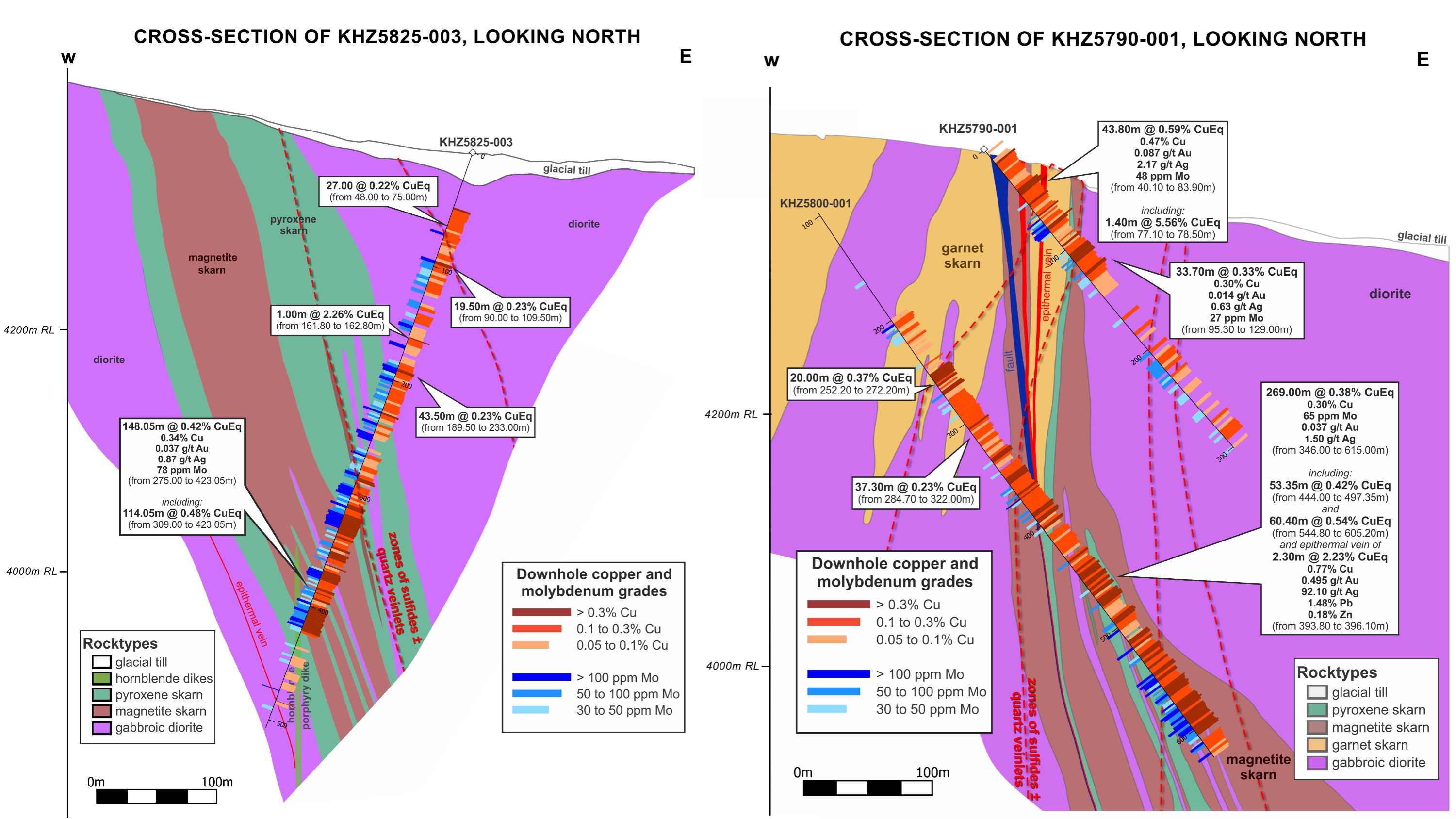 Figure 4. Cross-sections of the highlighted drill holes at the Khaleesi project in this release. (Left) KHZ5825-003 section showing higher-grade copper mineralization within a magnetite skarn and surrounding pyroxene skarn and diorite intrusion. (Right) KHZ5790-001 section showing the new shallow hole extending copper mineralization to near-surface, above an earlier hole that encountered 269.0m at 0.38% CuEq (0.30% Cu), with copper-mineralization in magnetite, garnet and pyroxene skarn, as well as veinlets within the diorite.
