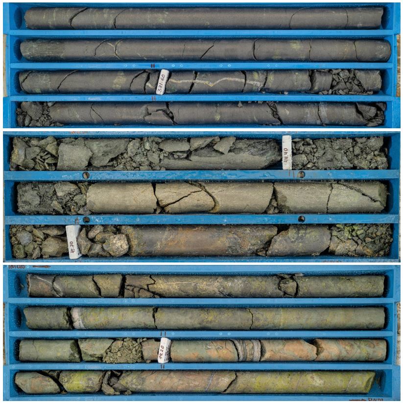 Figure 1: (Top) KHZ5825-003 Massive magnetite skarn cut by quartz-chalcopyrite-bornite veinlets and with disseminated chalcopyrite. The 1.7m interval assayed 0.67% copper, 0.063 g/t gold, 1.82 g/t silver and 122 ppm molybdenum from 370.9m to 372.6m downhole depth. (Middle) KHZ5790-001 Garnet-diopside skarn cut by pyrite-chalcopyrite mineralization. The 1.9m interval assayed 1.38% copper, 0.27 g/t gold, 7.14 g/t silver and 5 ppm molybdenum from 43.9m to 45.8m downhole depth. (Bottom) KHZ5790-001 garnet-diopside skarn with strong chalcopyrite mineralization, and cross-cutting quartz sulfides veinlets. The 1.4m interval assayed 4.91% copper, 0.42 g/t gold, 17.35 g/t silver and 164 ppm molybdenum from 77.1m to 73.5m downhole depth.