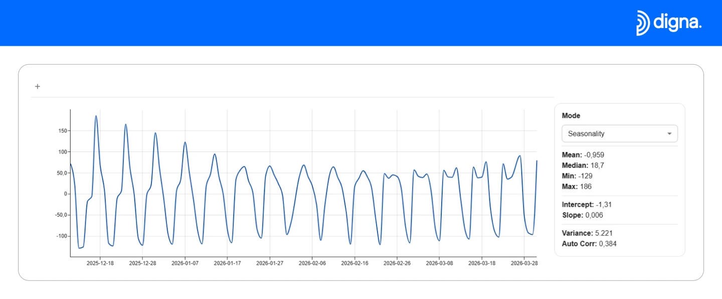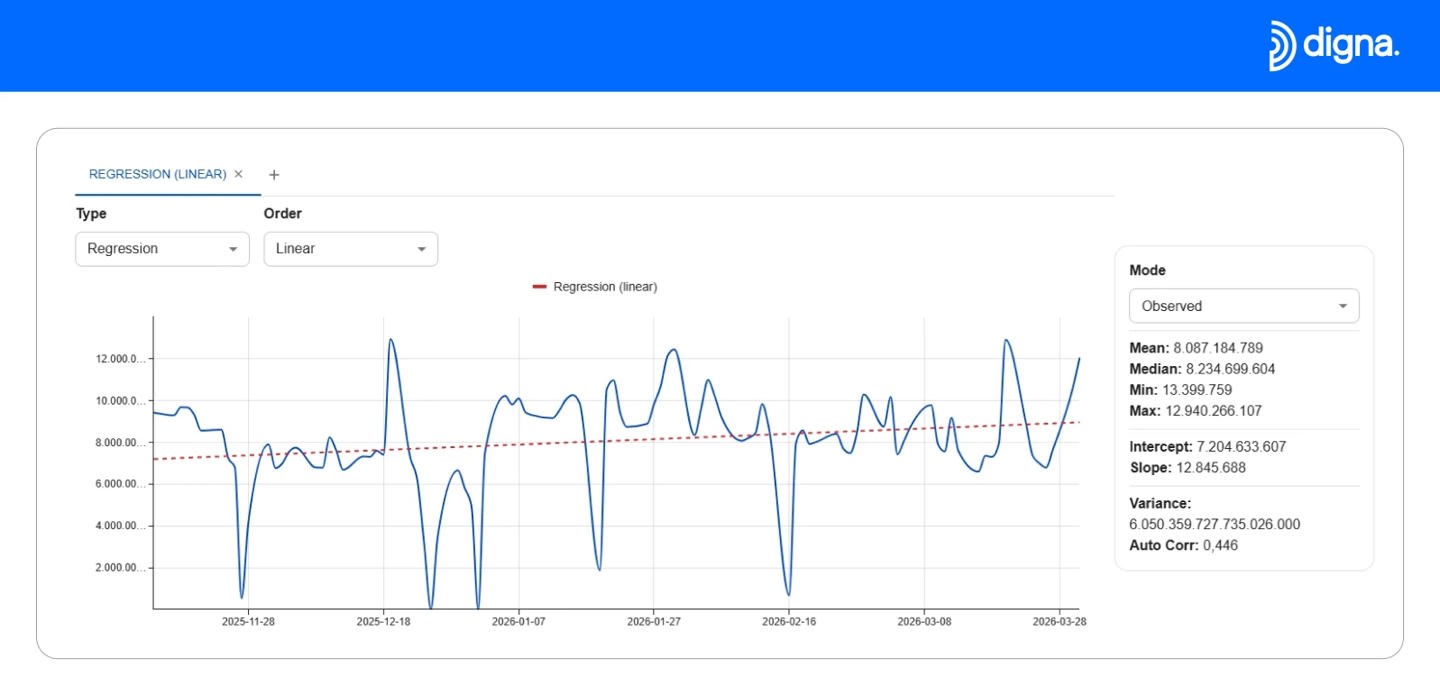 The release extends digna’s data analytics functionality with a new interactive charting capability that enables users to analyze time-series data directly within the platform. The feature includes built-in analytical methods such as linear, quadratic, and cubic regression, as well as piecewise regression with configurable breakpoints.