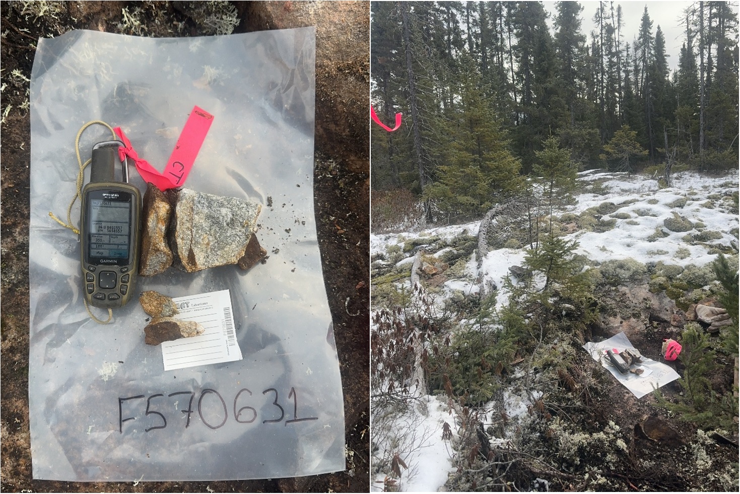 The 2025 exploration program was conducted by Bayside Geoscience of Thunder Bay, Ontario. The sampling campaign was conducted over ten days in November 2025. A total of 229 samples were collected, representing 102 quartz veins, 112 metavolcanic-metasedimentary rocks, 7 granitic rocks, and 8 mafic-ultramafic intrusive rocks. Extensive sampling was carried out along the margins of an interpreted granite-greenstone belt contact which is strongly delineated in the regional magnetic survey. Out of 225 samples twelve samples assayed returned anomalous gold between 0.01-0.05 g/t Au and one sample (F570631) returned 2.34 g/t Au (Figure 1).