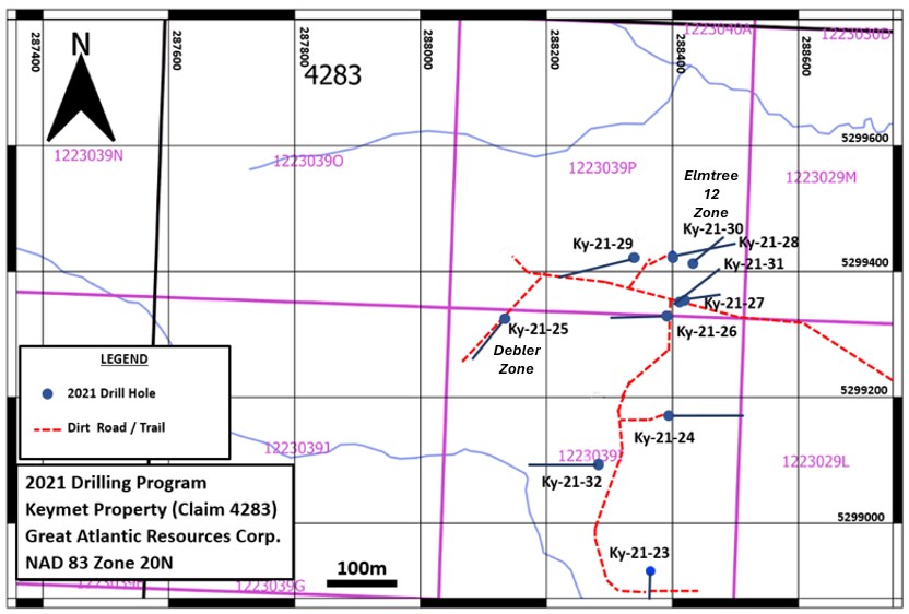 The 2021 drilling program, conducted within the northwest region of the Keymet Property, consisted of ten holes (2,661 total meters) testing numerous targets northwest of the historic Keymet Base Metal – Silver Mine. The 2021 drilling program, as with the 2015, 2017 and 2018 drilling programs (see Company news releases for results of 2015, 207 and 2018 drilling programs), targeted the area of the Elmtree 12 polymetallic vein system and nearby target areas.