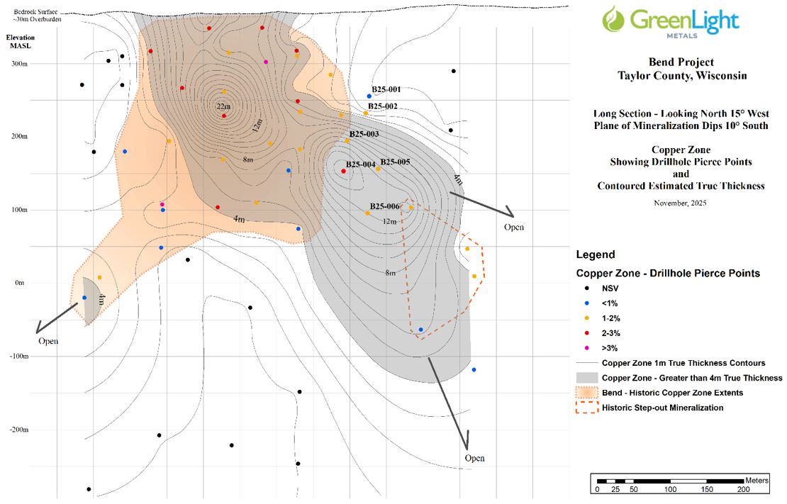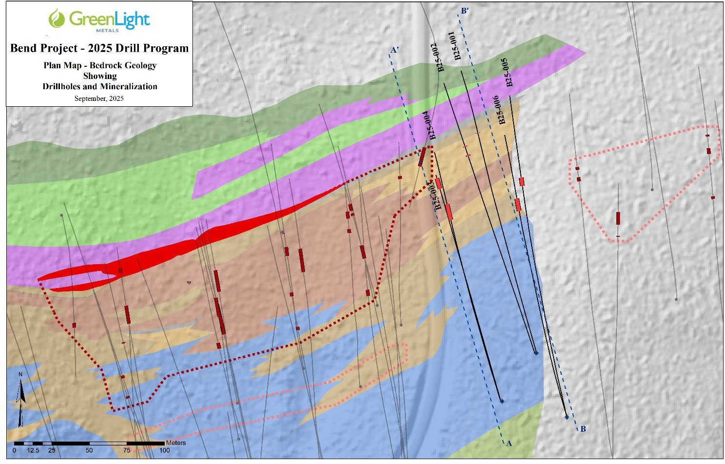 Medford, Wisconsin–(Newsfile Corp. – November 3, 2025) – GreenLight Metals Inc. (TSXV: GRL) (“GreenLight” or the “Company“) is pleased to announce additional high-grade Copper and Gold results from its Phase 1 drilling program at the Bend Project in Wisconsin, further to its October 21, 2025 news release reporting results from holes B25-004 through B25-005. The six-hole diamond drilling program, totaling 2,037 meters, was completed from three sites along two sections entirely on the Company’s leased forty-acre tract of private minerals.