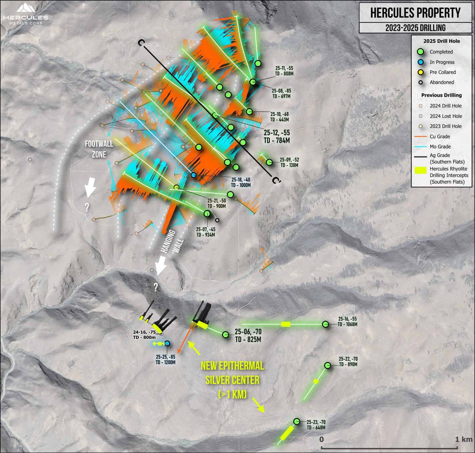 Figure 1: Drill plan. Grade bars for copper (orange) and molybdenum (blue), with the location of Figure 2’s cross-section (C-C’). Intervals of Hercules Rhyolite, the favourable host unit for silver mineralization, intersected by the first six holes drilled in Southern Flats, are shown in yellow-green along the drill traces. Rhyolite was intersected near-surface in 2024 drill hole 24-16 and 2025 drill holes 25-23 and 25-25.