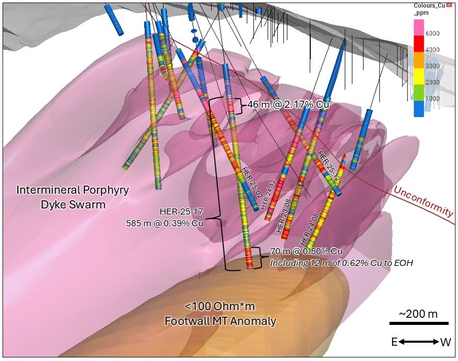 “HER-25-17 showed an increase in both copper and molybdenum grades upon entering what is now revealed to be a large MT conductor at depth, supporting the potential for expansion into new and previously untested zones of concealed copper mineralization.