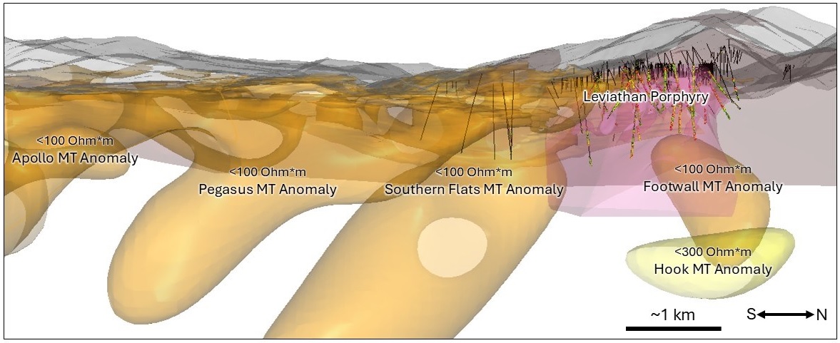 Figure 2: Long section across the entire Hercules system, showing known mineralization at the Leviathan Porphyry, as well as all MT anomalies less than 100 ohm-m in magnitude. The MT anomalies are defined by zones of high conductivity relative to the background conductivity of the host rocks and display geometries which may be associated with intrusive centers. From north to south these anomalies include: the Hook; Footwall; Southern Flats; Pegasus; and Apollo.