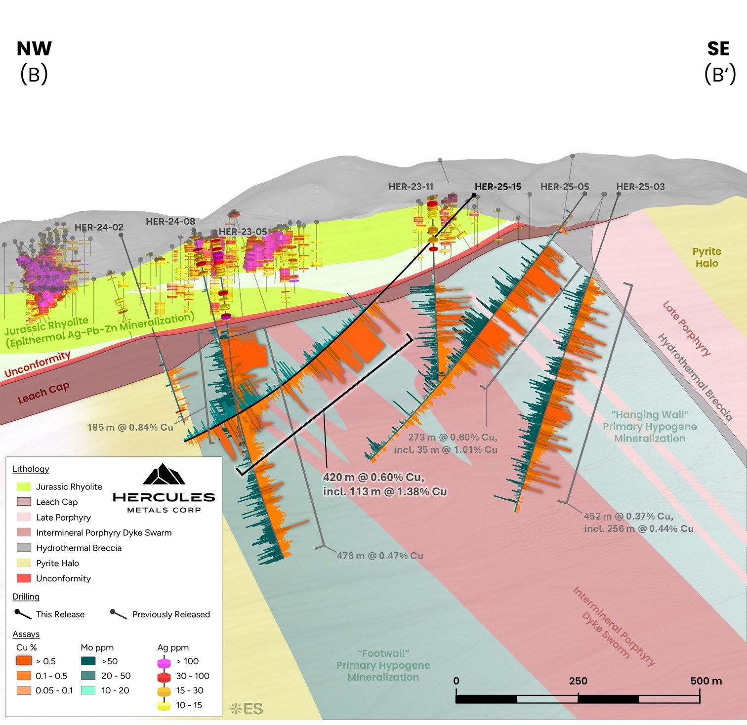 Figure 4: Cross-section B-B’, showing drill hole HER-25-15 relative to previous drilling on the fence.