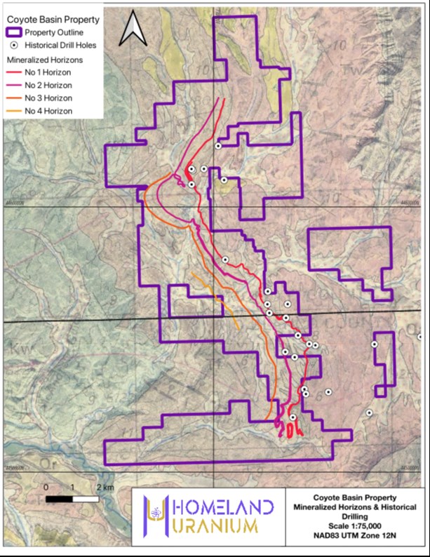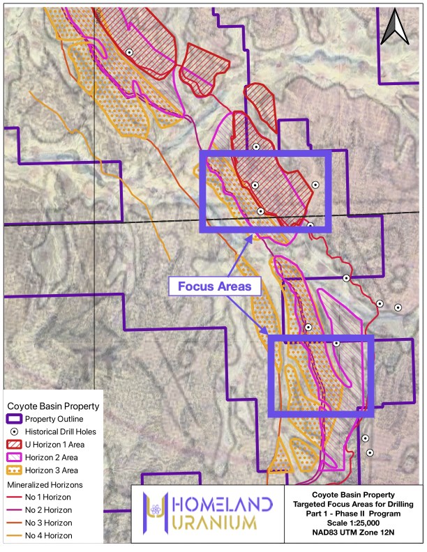 “Homeland and our shareholders have been eagerly anticipating the commencement of our maiden drilling campaign at Coyote Basin since the inception of the Company in March. Our initial drilling efforts will focus on the southernmost two of the three mineralized areas defined in the late 1970s by the previous operator Western Mining with the objective of initiating the conversion of the known historical uranium resources to modern resource standards,” stated Roger Lemaitre, President and CEO, Homeland Uranium.