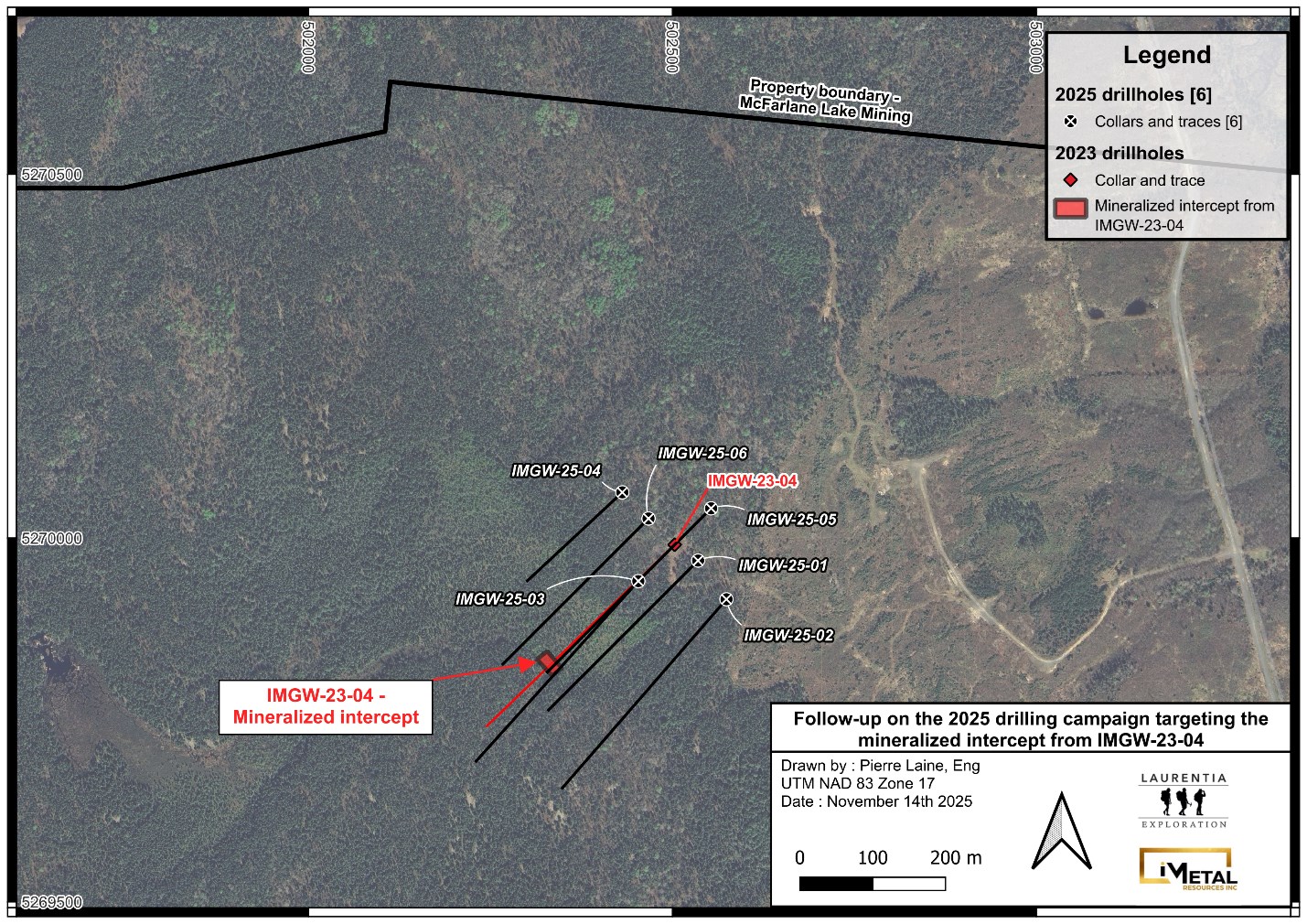 Vancouver, British Columbia–(Newsfile Corp. – November 27, 2025) – iMetal Resources Inc. (TSXV: IMR) (OTCQB: IMRFF) (FSE: A7VA) (“iMetal” or the “Company“) has completed 2025 Phase I drilling at the Company’s Gowganda West (“GW”) project. Core logging and sampling is in progress and samples will be sent to the ALS Minerals laboratory in Val D’or, Quebec. The drill program focused in the area of IMGW23-04, at the location of the spring 2023 discovery hole of 48.5m of 0.85 g/t Au starting at 316.5m (see News Release dated 2023-Jun-06).