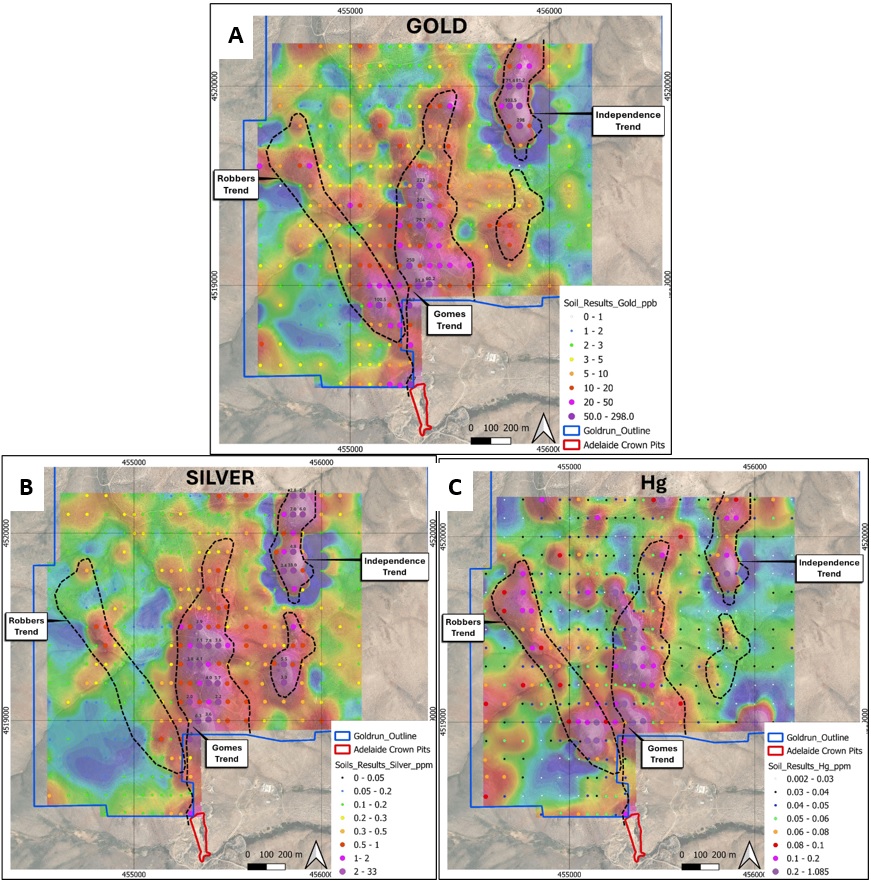 Figure 2: Preliminary Gridded Geochemical Map Proximal to the Adelaide Crown Pits Highlighting A) Gold Soils Results; B) Silver Soil Results; and C) Mercury Soil Results. Geochemical Maps Outline Three similar trends: Robbers Trend; Gomes Trend; and Independent Trend