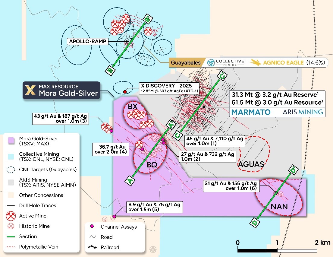 “Collective Mining’s Guayabales continues to move closer with the first drill hole at the X Target, located adjacent to the northern border, intersecting 12.85m at 503 g/t silver equivalent. Adjoining along the eastern border, Aris Mining reports Marmato upgrade target of 200,000 ounces p/year starting Q4, 2026, highlighting the prospectivity of Mora,” he concluded.