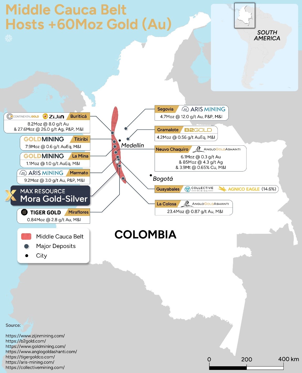 | Titiribi | M. Resource: 85Mt at 1.06g/t AuEq. For 1.69MozEq. | https://www.goldmining.com/projects/colombia/titiribi-project/ |