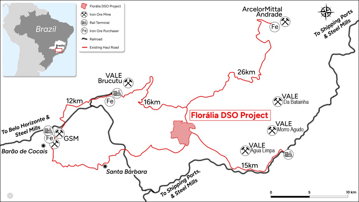 The Florália Iron Property (mineral right 832.022/2018) in Brazil lies within Minas Gerais, Brazil’s largest iron ore and steel producing State. The Property has established road access to rail terminal (15 km) linking to steel mills and shipping ports; roads connect to DSO buyers Vale (16 km) and ArcelorMittal (26 km) ensuring efficient logistics and market access. Max’s technical team has significantly expanded the Florália Iron Geological Target from 8-12Mt at 58% Fe to 50-70Mt at 55%-61% Fe (refer Figure 4).