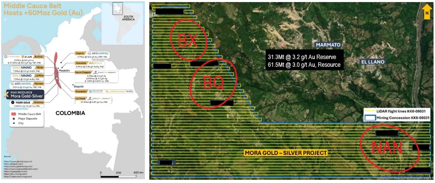 - The undrilled Mora Property encompasses over 40 historic workings, 5 active mines, a series of exposed polymetallic structures over 2,500m by 1,000m, adjacent to Aris Mining’s (TSX: ARIS) (NYSE: AIMN) 9.2Moz Marmato Gold Operation (P&P Reserves: 31.3Mt@3.2 g/t Au for 3.2Mozs, M&I Resources: 61.5Mt@3.0 g/t Au for 6.0Moz, Inferred Resources: 35Mt at 2.4 g/t Au for 2.8Mozs ¹).