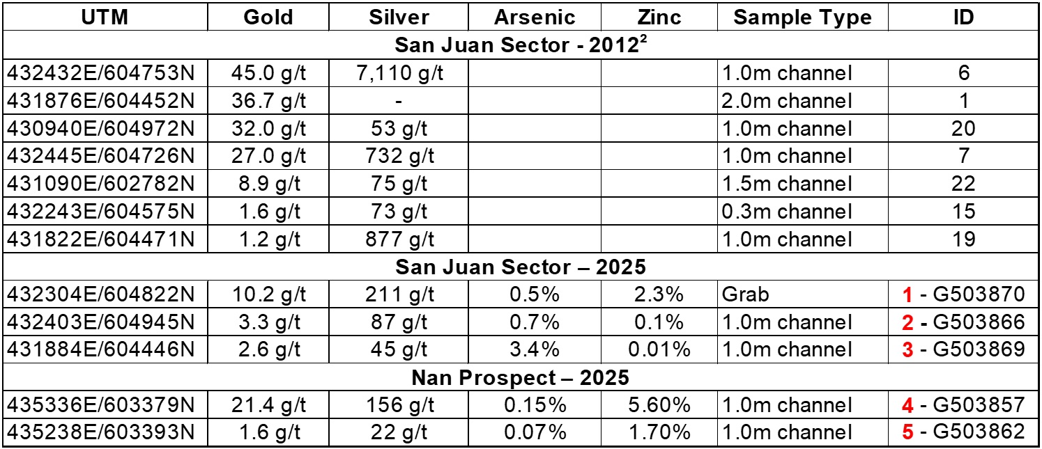 Table 1. Highlight Assay Results for 2012² and 2025 Field Investigations.