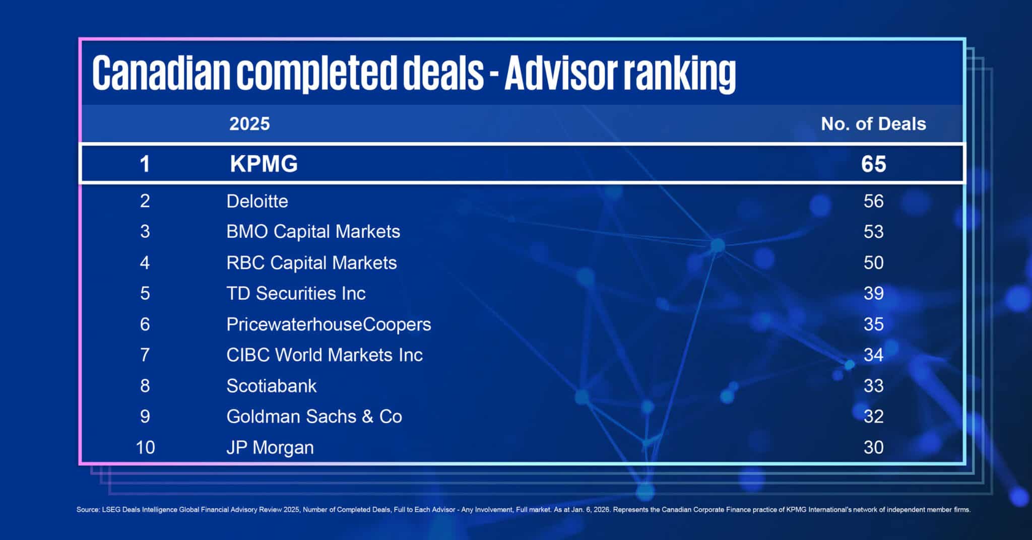 KPMG Canada ranked the No. 1 M&A advisor in 2025