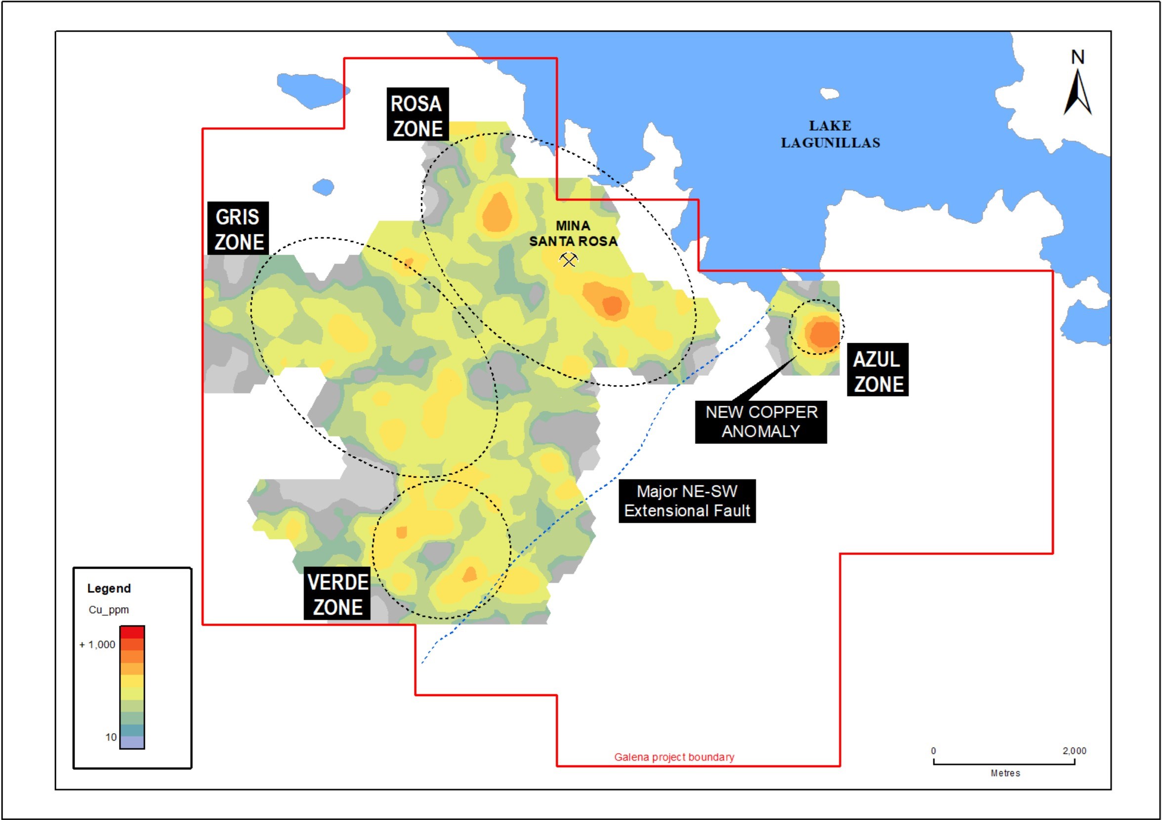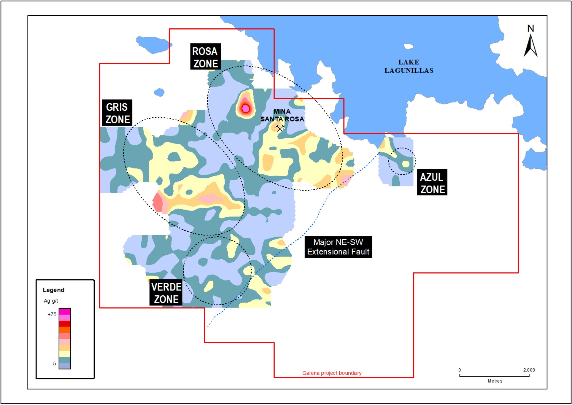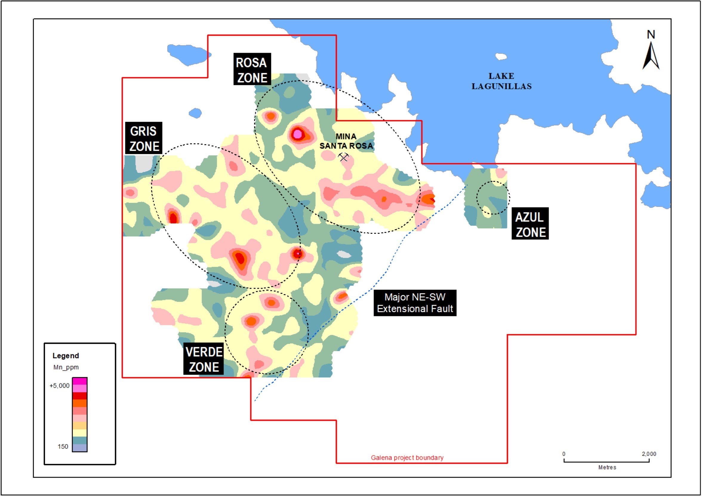 A 6 x 6 km manganese anomaly covers the area between the Rosa and Azul zones to the northwest and northeast, respectively and the Gris and Verde zones to the southwest and southeast, respectively (Figure 2), confirming that Galena could host blind CRD mineralization of similar scale to Berenguela and Santa Barbara.