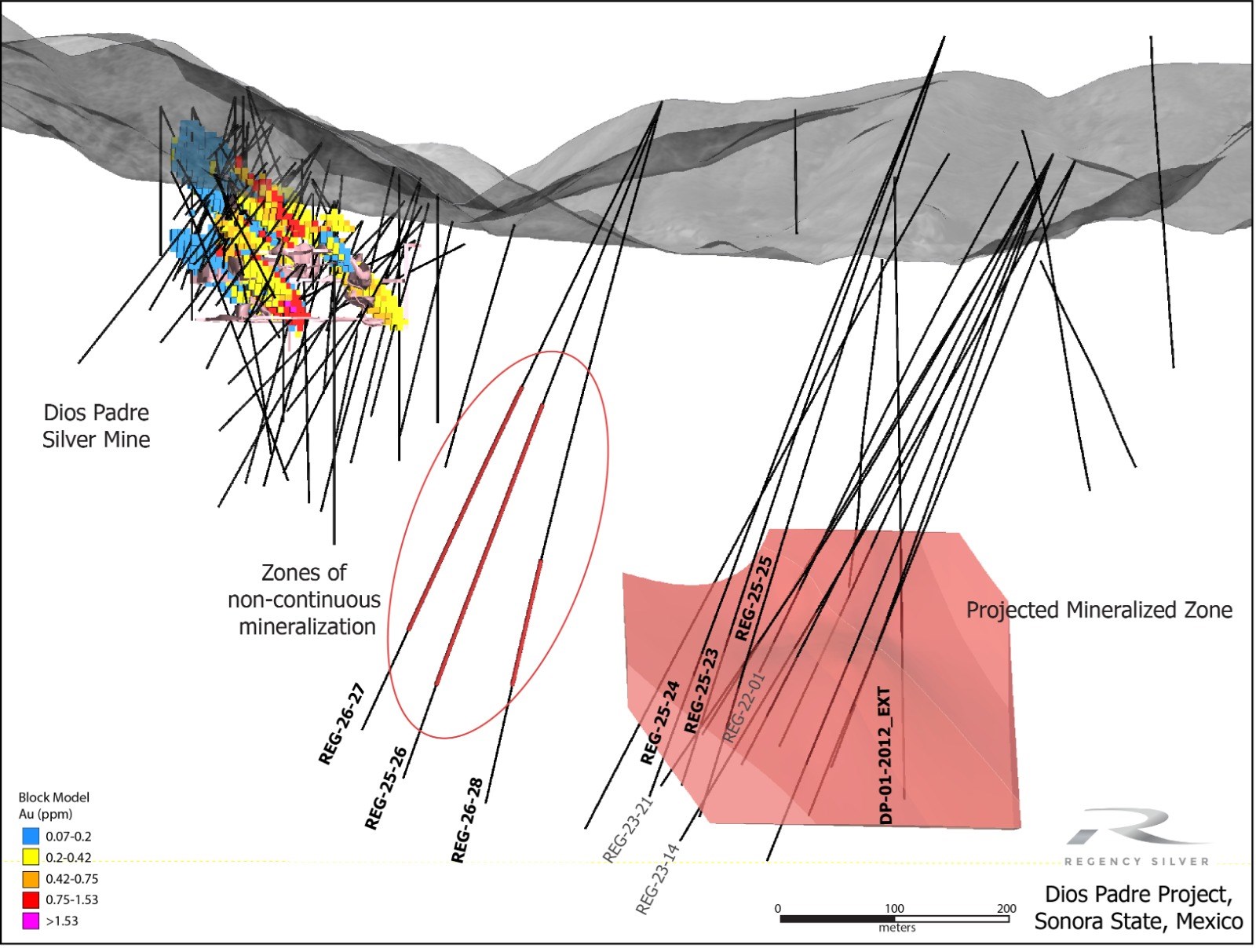 Vancouver, British Columbia–(Newsfile Corp. – February 4, 2026) – Regency Silver Corp. (TSXV: RSMX) (OTCQB: RSMXF) (FSE: ZJ90) (“Regency Silver” or the “Company”) is pleased to announce that the second hole of its ongoing 2026 drill program at its Dios Padre project in Sonora, Mexico has intersected sulphide-specularite bearing breccia and vein-infill in multiple zones across a broad interval (Figure 1). Hole REG-26-28 was drilled ~75m below Hole REG 25-26 and intersected broad mineralization from ~430m to ~540m. A breccia zone with chalcopyrite, pyrite and specularite with intense silica-sericite alteration is intersected from ~500m to ~535m. The core zone is ~ 180m to the south of a similar breccia intersected in REG-25-25 (See news release dated December 8, 2025). Previously drilled holes REG-23-21 yielded 38m of 7.36 g/t gold, REG-22-01 yielded 35.8 metres of 6.84 g/t gold, 0.88% copper and 21.82 g/t silver, and REG-23-14 yielded 29.4 m of 6.32 g/t gold.