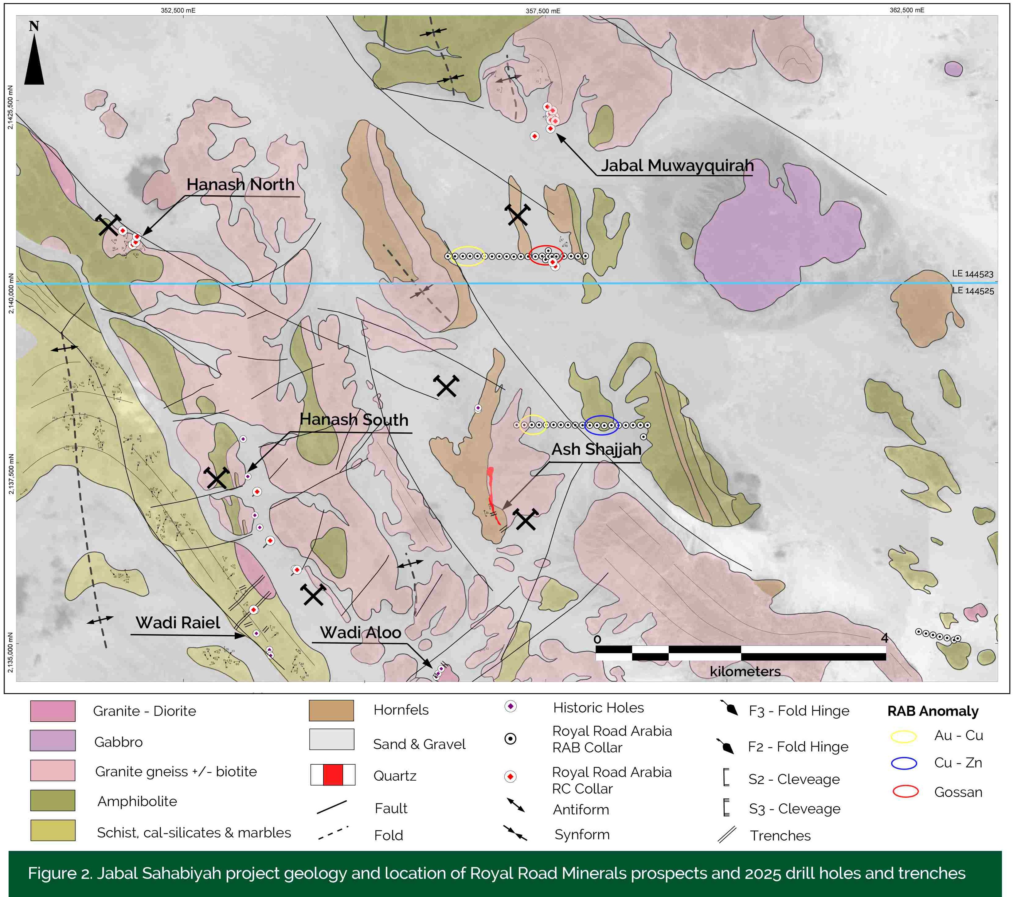 Royal Road has completed 2,486 meters of reverse circulation drilling at Jabal Sahabiyah as a combination of targeted scout-style drill holes, testing geophysical anomalies and extensions of surface occurrences beneath cover rocks (21 drill holes for a total of 1868 meters); and RAB-style shallow-drilling beneath recent soil and alluvial cover (52 drill holes for a total of 618 meters). The Company has also completed trench and rock-chip channel sampling across outcropping and shallow-concealed sheeted vein-gold style mineralization (see Figure 2).