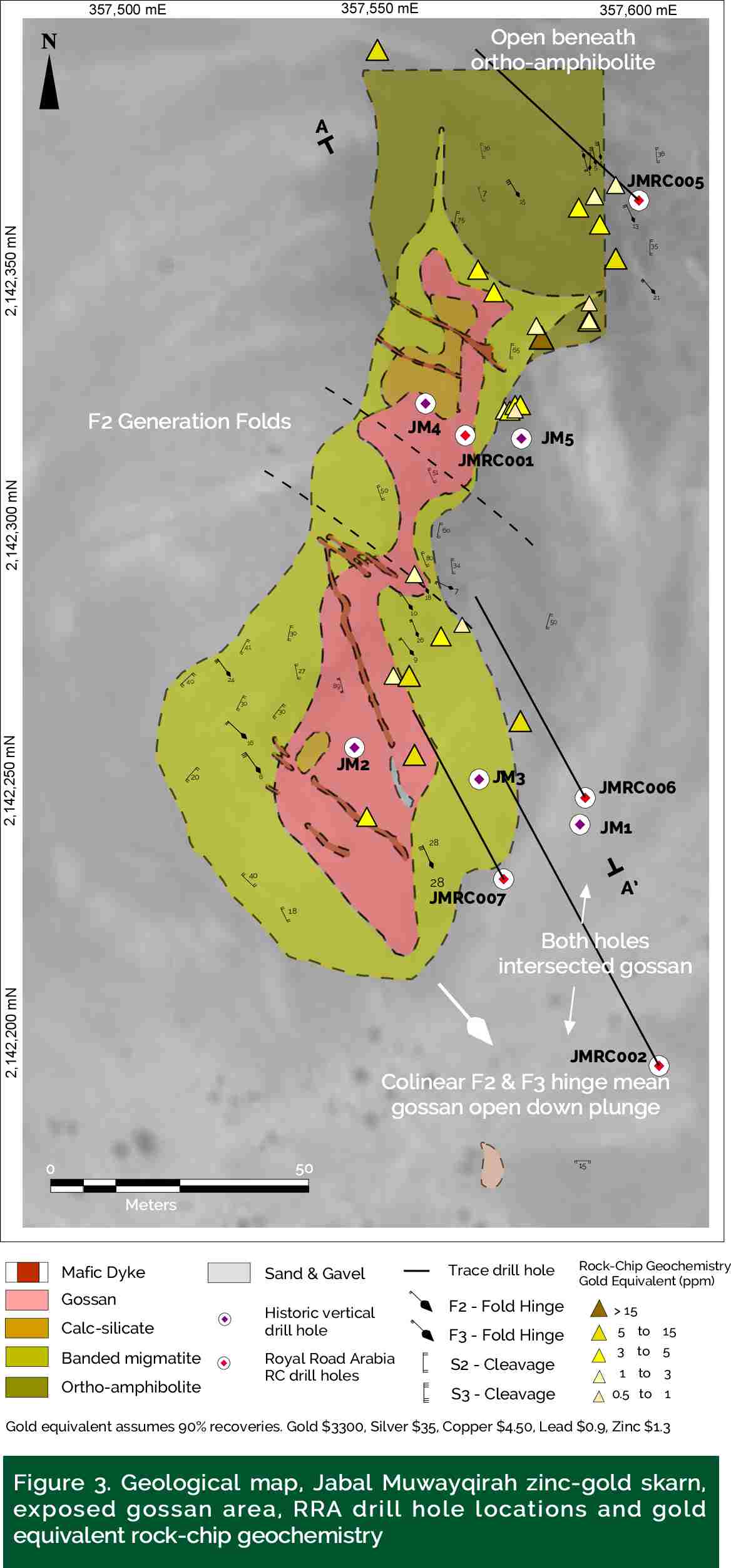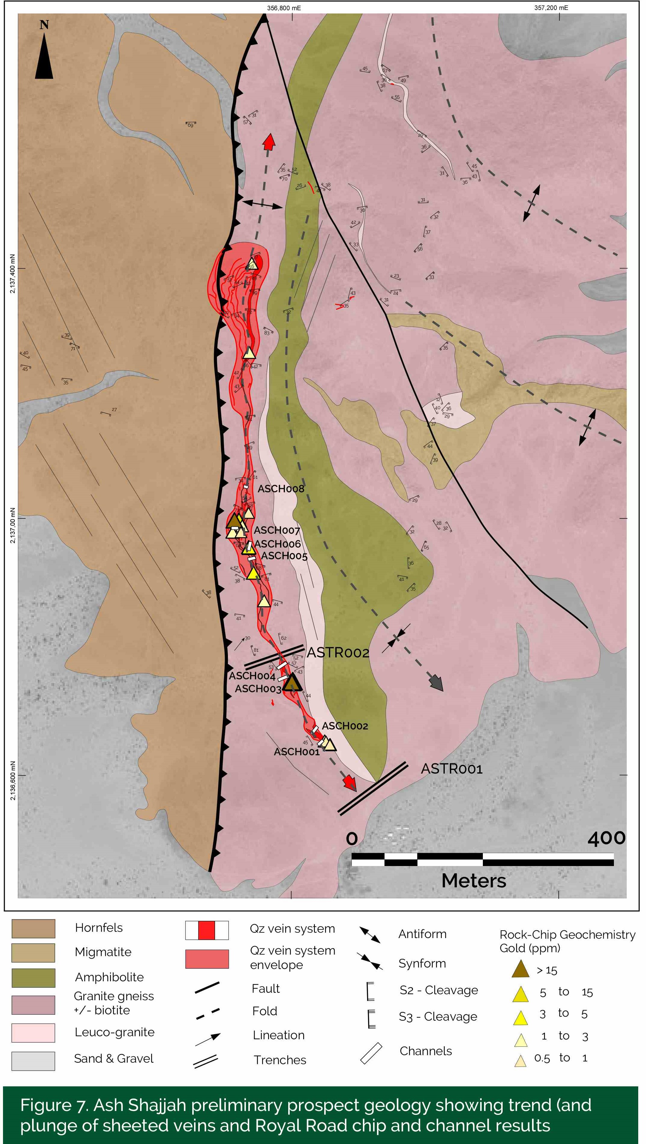 “This program is typical of a successful first-pass, exploratory drilling and sampling campaign” said Tim Coughlin, Royal Road’s President and CEO. “Our work has for the first time confirmed the presence of zinc-precious-metal skarn mineralization at Jabal Sahabiyah and, importantly, has highlighted the potential for significant gold in previously untested sheeted vein systems. We are particularly excited by the obvious potential at Ash Shajjah which is exposed over a one-kilometer strike length but remains open down plunge, along and across strike. We now have some dots to join, and so the next stage of our program will focus on systematic drill-targeting, supported by detailed mapping and geophysics in order to unravel the true size and continuity of both the skarn and vein-style systems.”