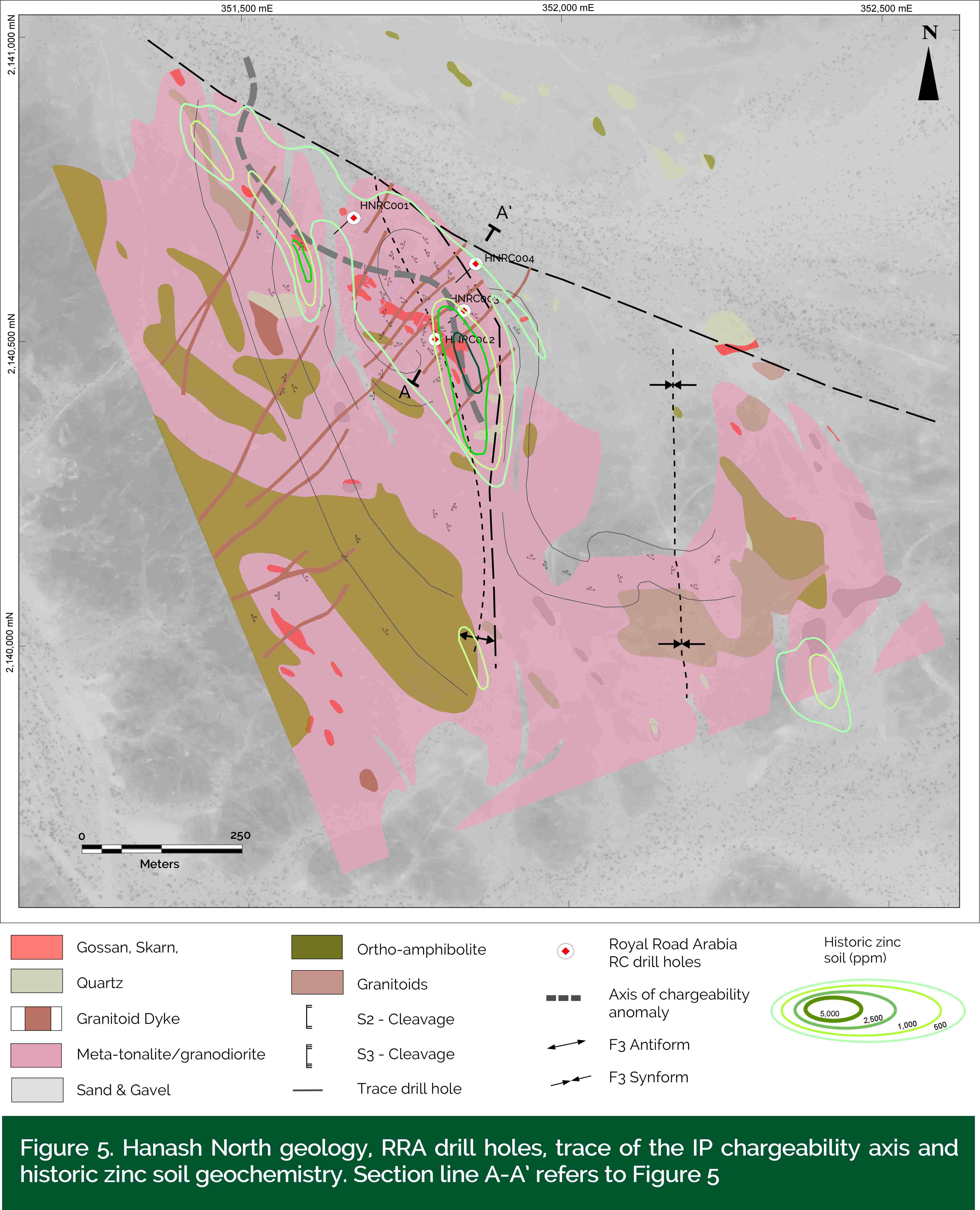 The Hanash South prospect (see Figure 2) was first drilled by Riofinex in the late 1970s, targeting a 2.3-kilometer long IP chargeability anomaly linked to sulphide mineralization with anomalous zinc, copper and silver over downhole intervals exceeding 50 meters. RRA twinned three of these historical holes to test for gold within the sulphide zones (not systematically assayed by Riofinex). While the drilling only returned localized anomalies in zinc and copper (e.g., HSRC001: 1 meter at 1.6% zinc and 0.1% copper from 83-84 meters, and 1 meter at 0.4% copper and 8.1 ppm silver from 88-89 meters), the broader intersections confirmed sulphide mineralization extending across 20-50-meter downhole intervals. Importantly, RRA interprets Hanash South as representing a distal but significant alteration zone that may indicate proximity to a larger skarn-style mineralized system. Follow-up geological mapping is now underway to better define the structural setting and refine follow up drill targets.