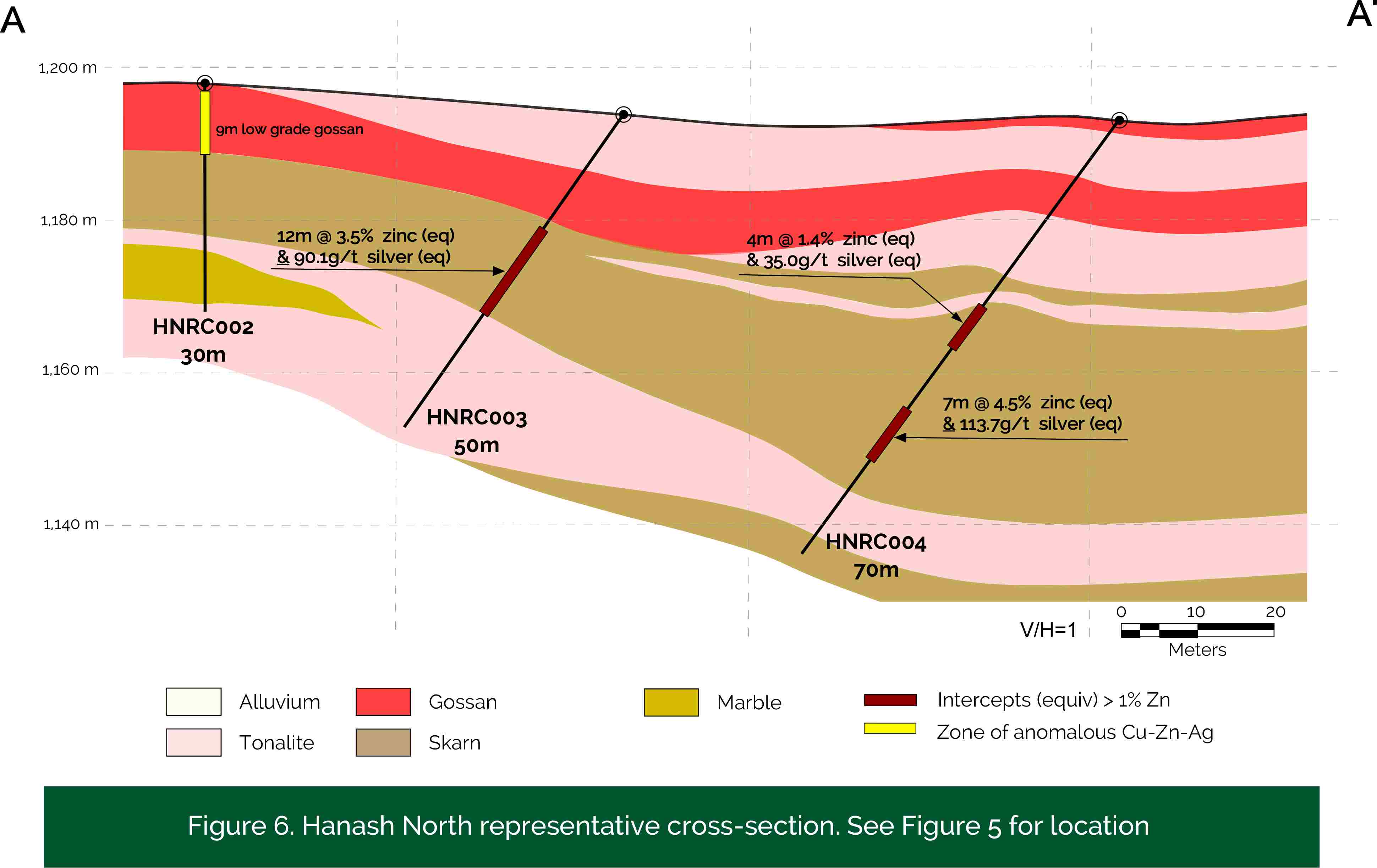 Polymetallic gossans (oxidized sulphide mineralization) are evident on surface at the Jabal Muwayqirah and Hanash North prospect areas. In both cases, mineralization is related to layered, garnet-bearing, calc-silicate rocks, located proximal to a contact with granitoid intrusions. Scout drilling has revealed that the Jabal Muwayqirah prospect (see Figure 2) is characterized predominantly by zinc-gold-silver ± copper mineralization at shallow oxidized levels, transitioning to gold and silver dominated calc-silicate skarn-style mineralization at deeper sulphide-dominated levels (see Table 1 and Figures 3 and 4). Hanash North is a zinc-silver-copper dominated mineralized skarn system, which scout drilling reveals is oriented parallel to a 600 meter long Induced Polarization (IP) chargeability axis, identified by Riofinex in the late 1970’s. Mineralization intercepted by scout drilling, is entirely transition or sulphide in nature, extends across downhole thicknesses of up to 12 meters and can be traced horizontally along the axis of the chargeability anomaly for at-least 250 meters, remaining open towards the northwest and southeast (see Table 1 and Figures 5 and 6).