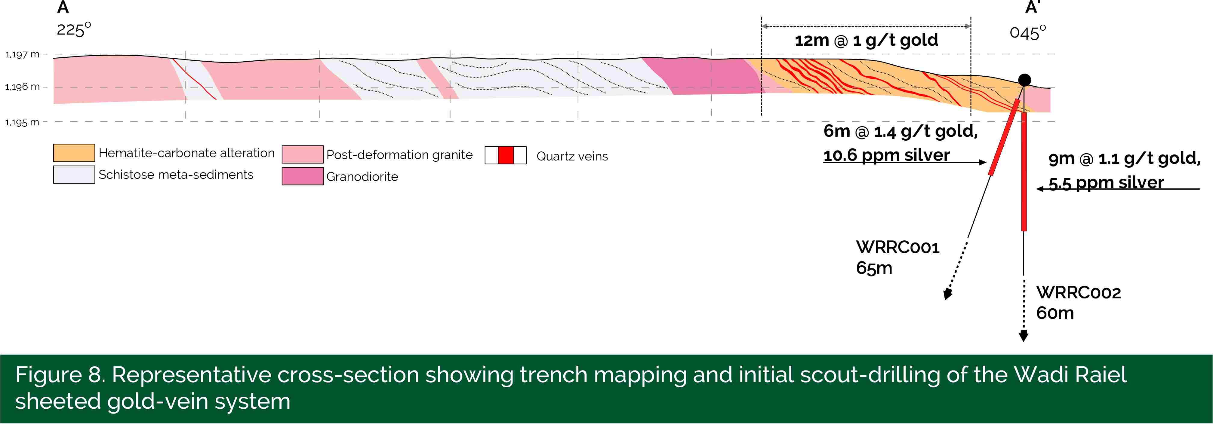 Exploration at Jabal Sahabiyah has confirmed potential for sheeted-vein gold and silver mineralization at the Ash Shajjah, Wadi Raiel and Aloo prospect areas (see Figures 2 and 7). Recent work by RRA, including channel and trench sampling, ground magnetic and radiometric surveys, and two scout drill holes at Wadi Raiel, has mapped out extensions to known surface occurrences and returned broad low-grade mineralized intersections exceeding 10 meters in width (see Table 2 and Figure 8). Rock-chip sampling of quartz vein material has delivered grades of up to 36.8 grams per tonne gold (minimum 0.002, mean 0.54 grams per tonne gold), underlining the potential for localized (plunging) higher grade sections of the gold mineralized system. The Ash Shajjah mineralized gold vein system has been traced for a strike-length of one kilometer before it plunges below sequence towards the north and is concealed under cover to the south.