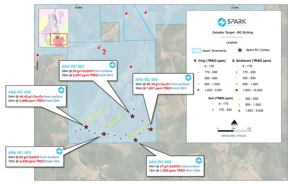 Figure 1: Maiden RC drill hole locations and selected near-surface rare earth and gallium intercepts at the Arapaima Project. Yellow lines, labeled A-A’, B-B’, and C-C’, indicate cross-sections shown in Figures 2 to 4.