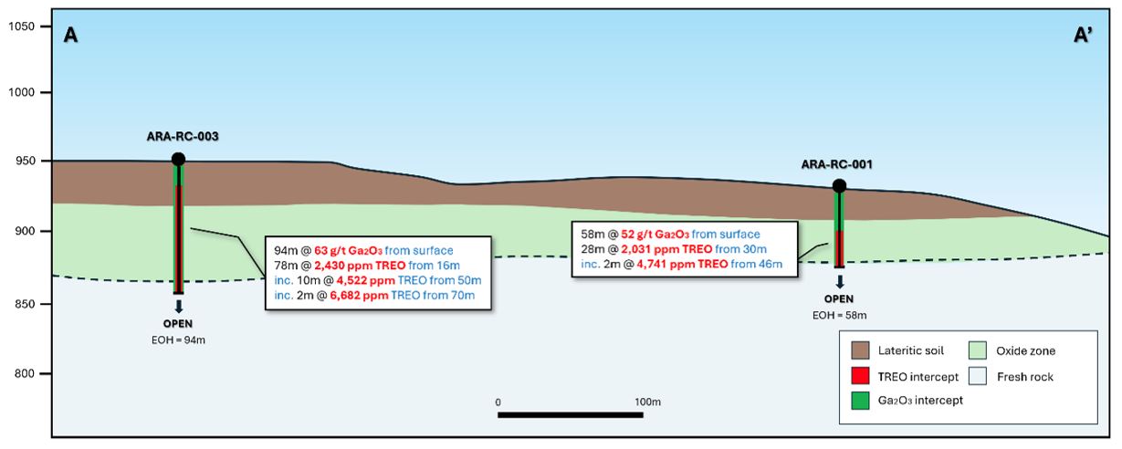 Figure 2: Cross-section A-A’ highlighting the mineralized intercepts in holes ARA-RC-001 and -003.