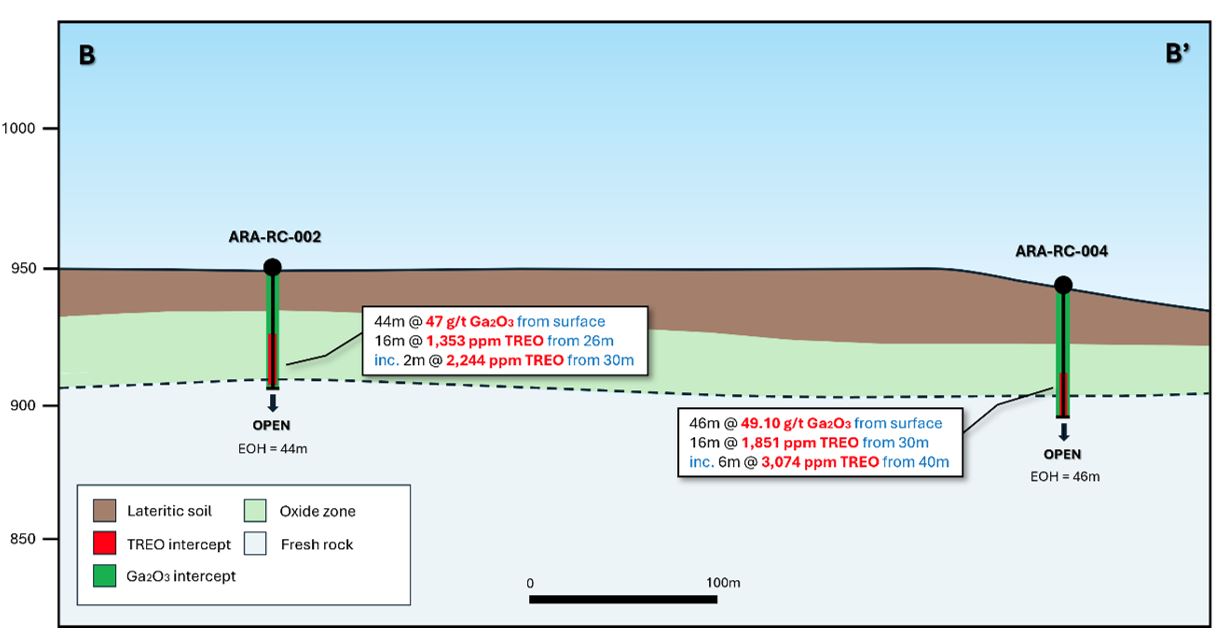 Figure 3: Cross-section B-B’ highlighting the mineralized intercepts in holes ARA-RC-002 and -004.