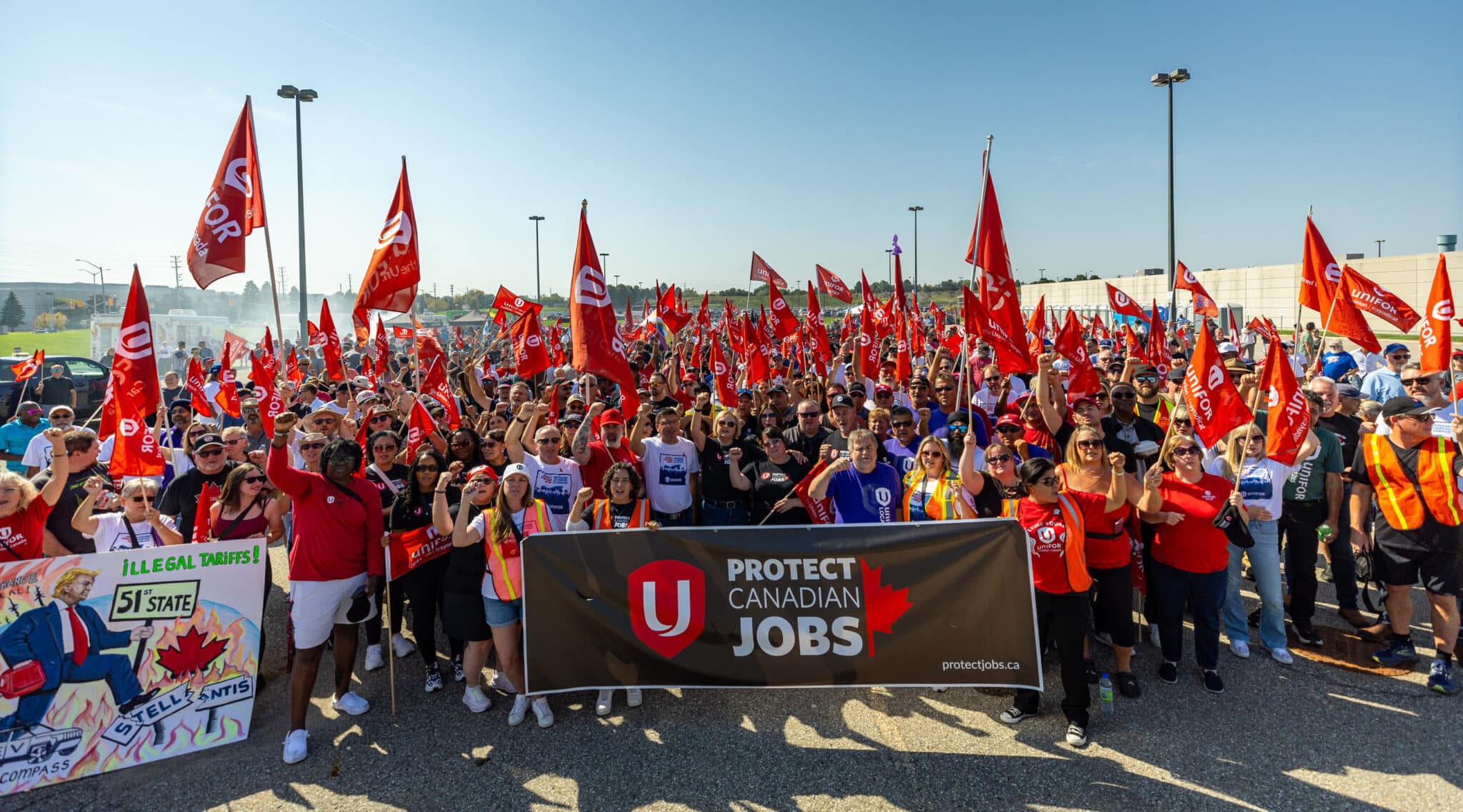The family-friendly rally was held in front of the Stellantis Brampton Assembly Plant, where retooling for next-generation electric and gas-powered Jeep vehicles has been stalled since February. The delay followed the U.S. government’s announcement of tariffs on Canadian imports, including a 25% tariff on Canadian-built vehicles, a move that has jeopardized approximately 3,000 jobs at the facility.